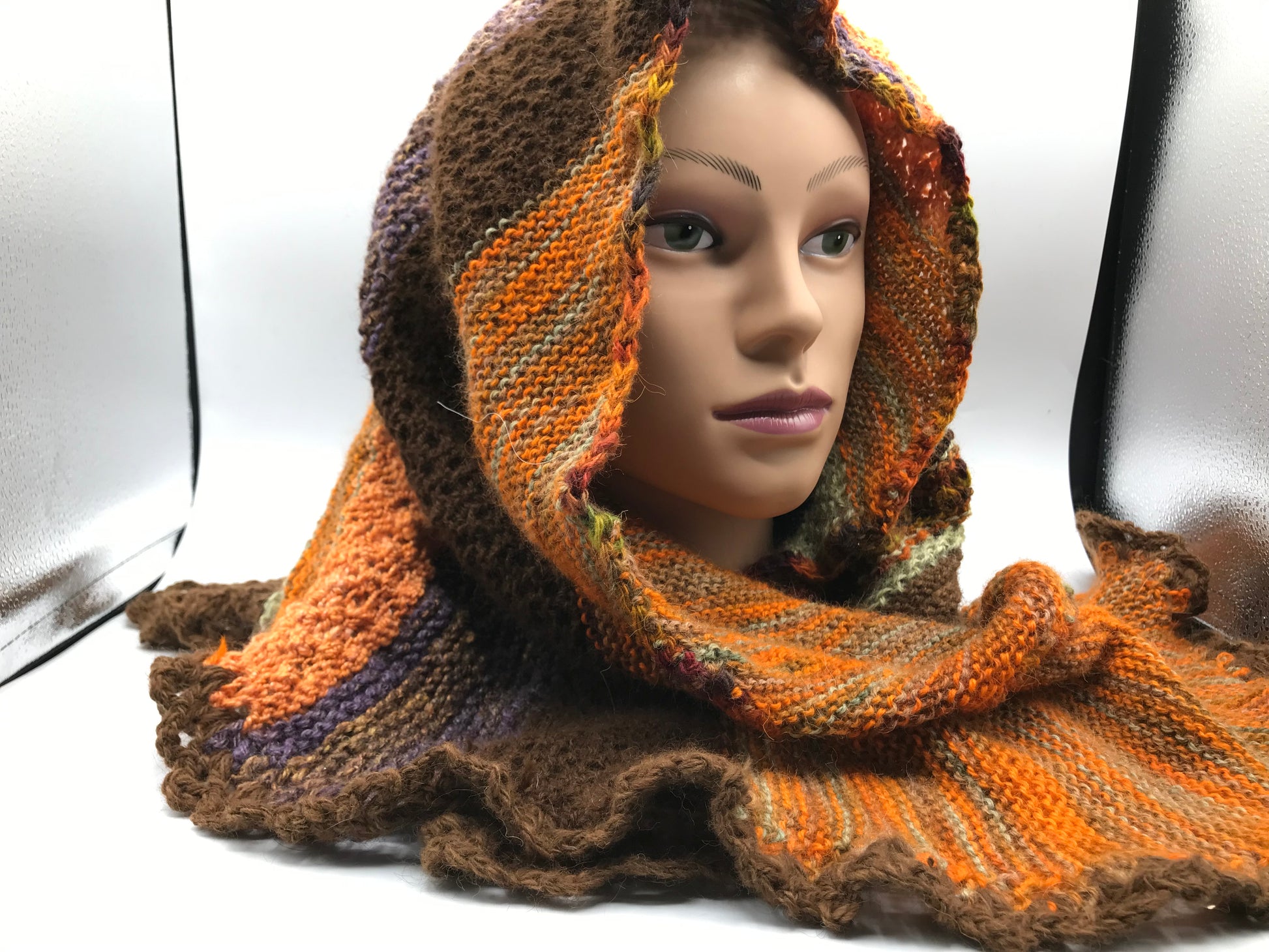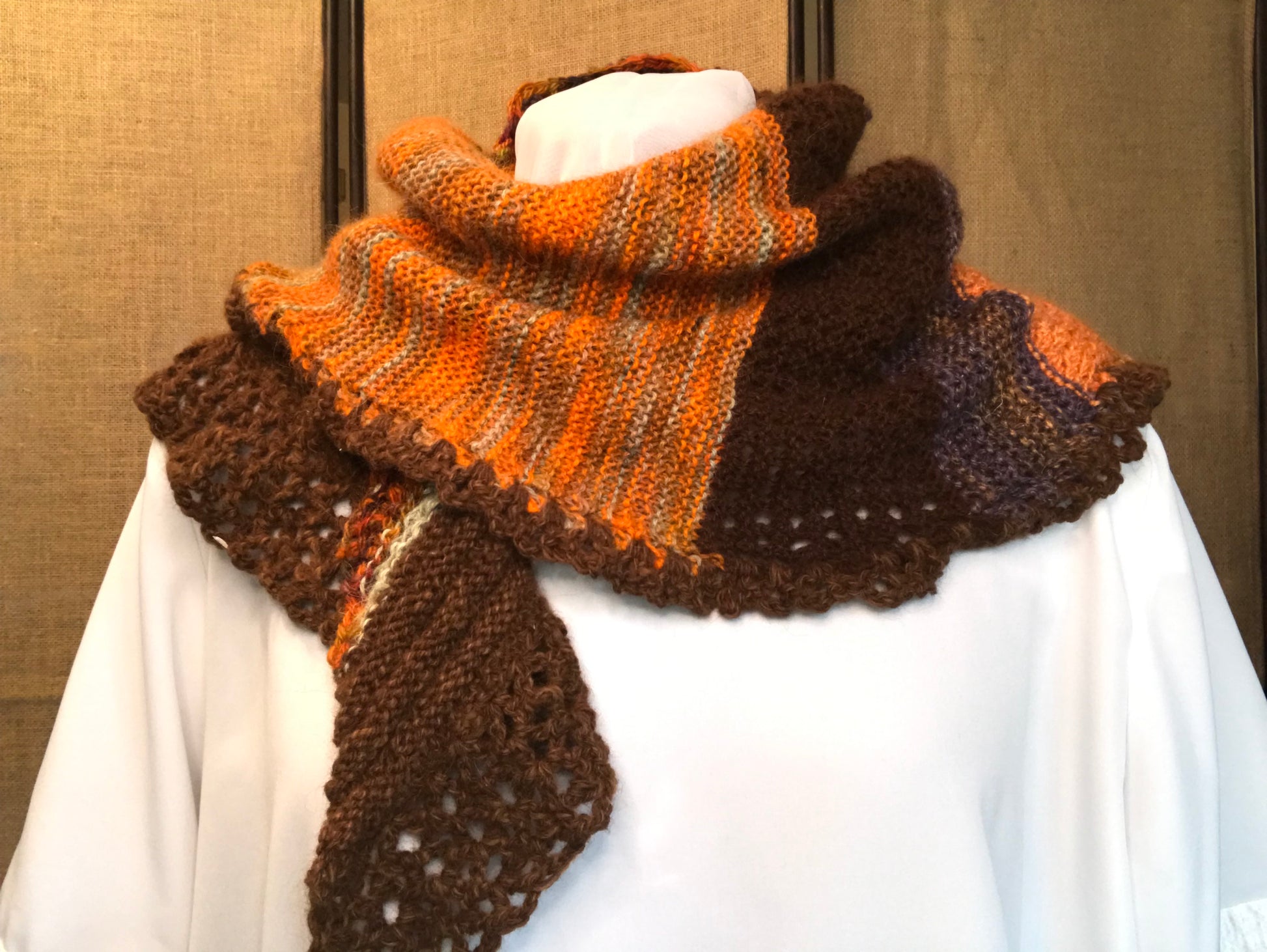 Handspun and commercial yarn was used in the creation of this one of a kind shawls. Both knitting and crochet were employed using a variety of stitches to create intricate patterns and textures. 52" width across the top, left side 46", right side 49". Fibers include alpaca, merino, corridale and silk making this shawl luxuriously soft and snuggly. Wrap yourself or someone you love in this piece for a toasty neck and shoulders.
