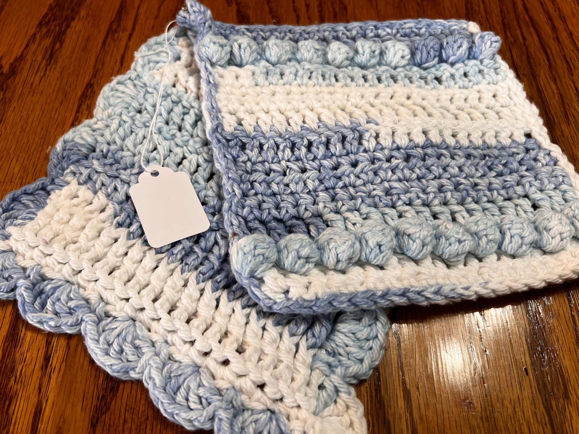 2 soft cotton wash cloths make bath time fun. Shades of blue and white. 7” x 7”.