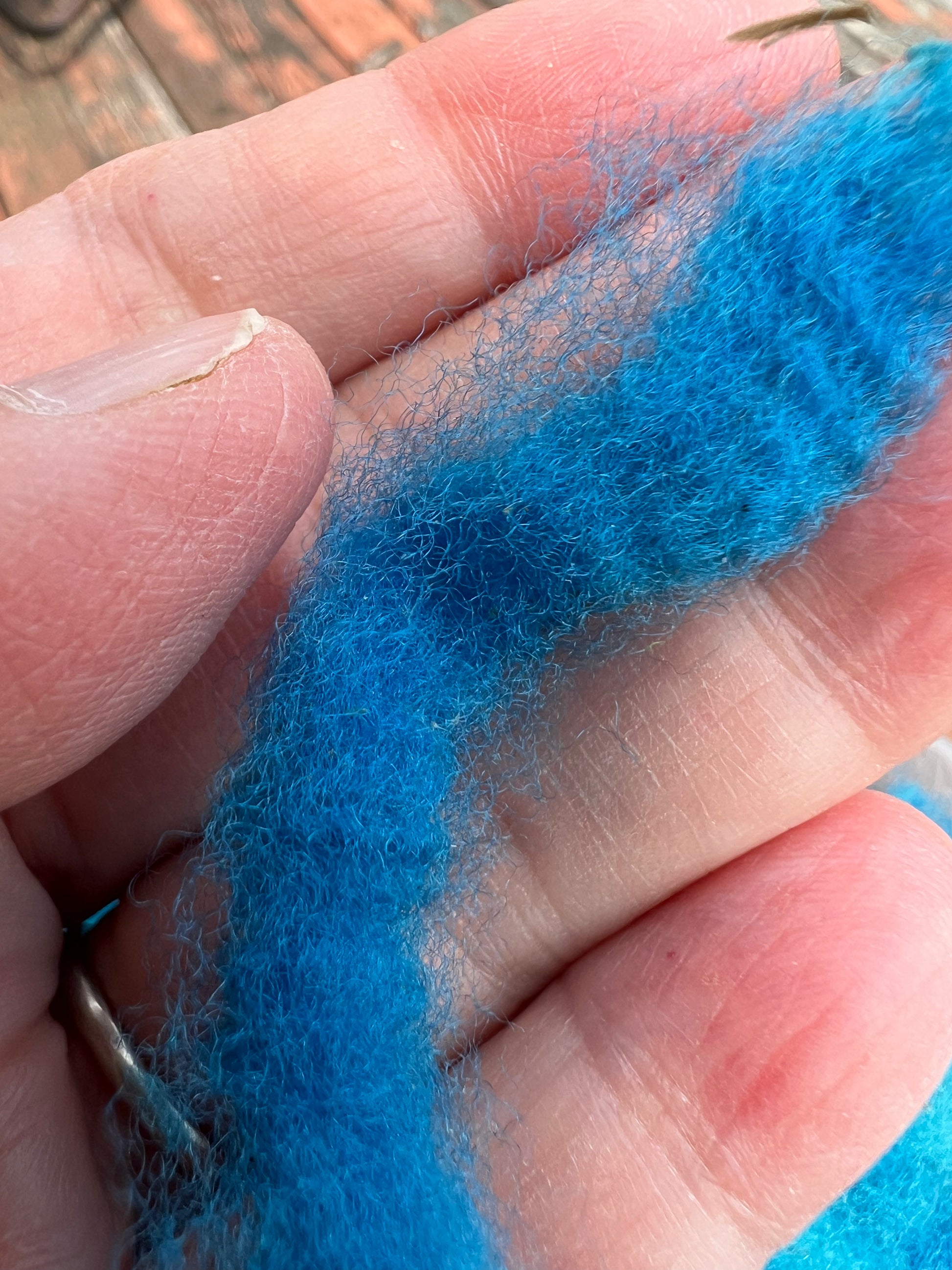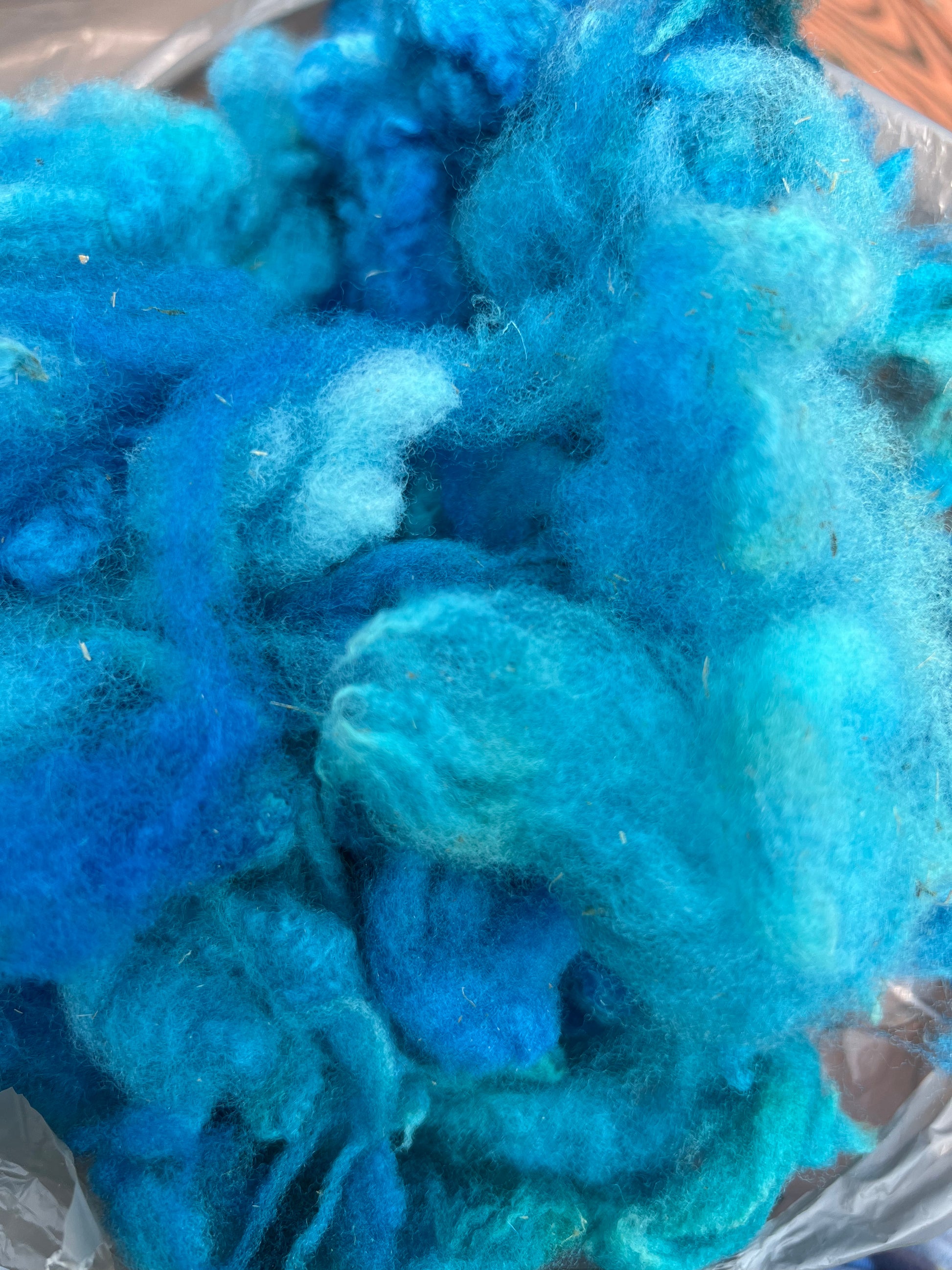 100% Polypay a soft crimpy wool that spins up into a bouncy yarn that is great for knitting. This hand-dyed fiber can be carded, combed or simply pulled apart for Spinning from a fiber cloud.. Polypay makes a warm lofty, round three ply yarn. Very easy to spin. I recommend it to new spinners because it can be easily spun short or long draw. 4+ oz.