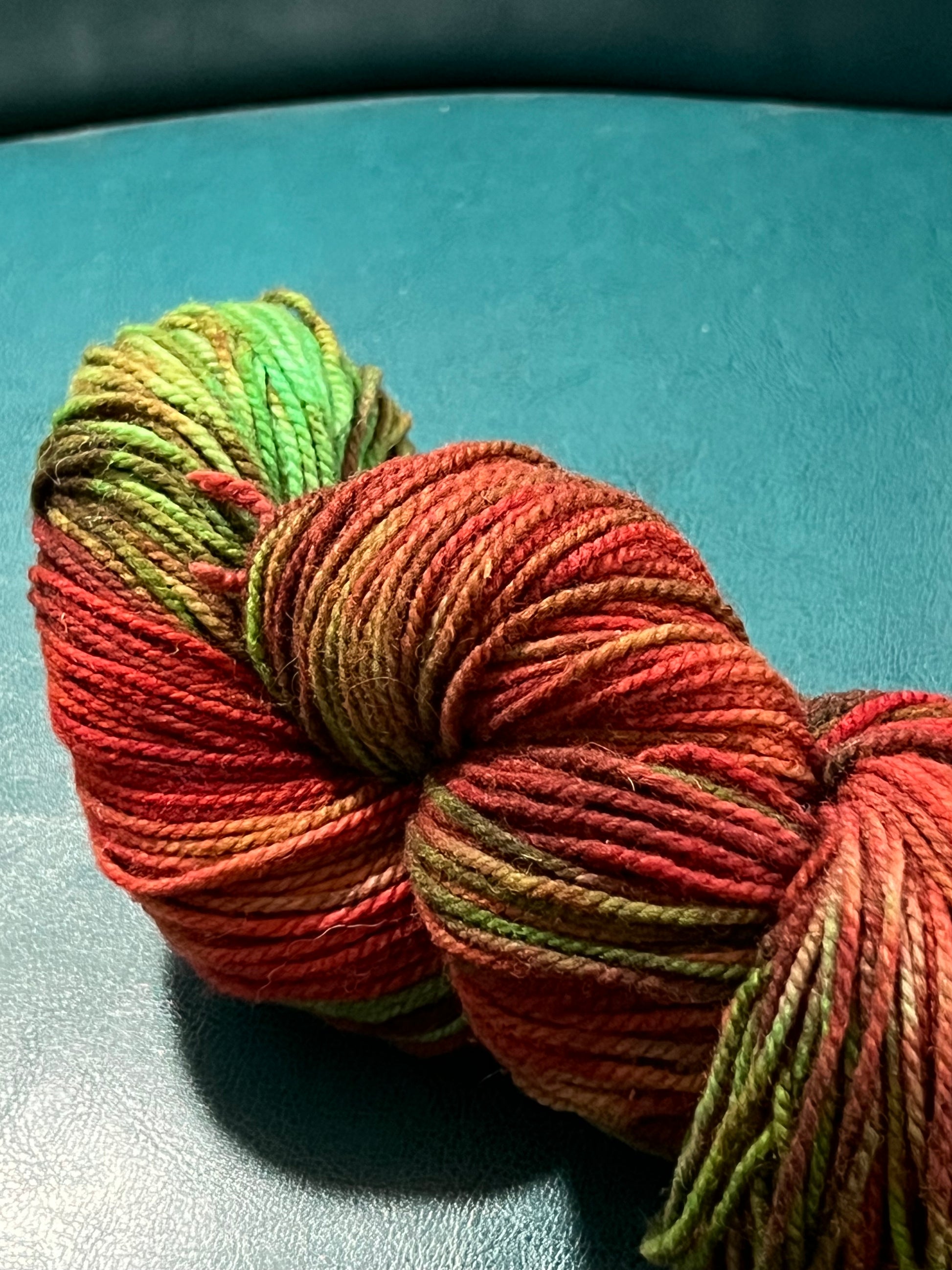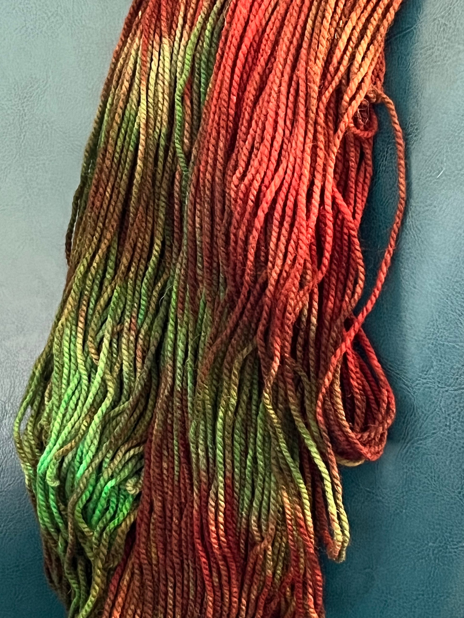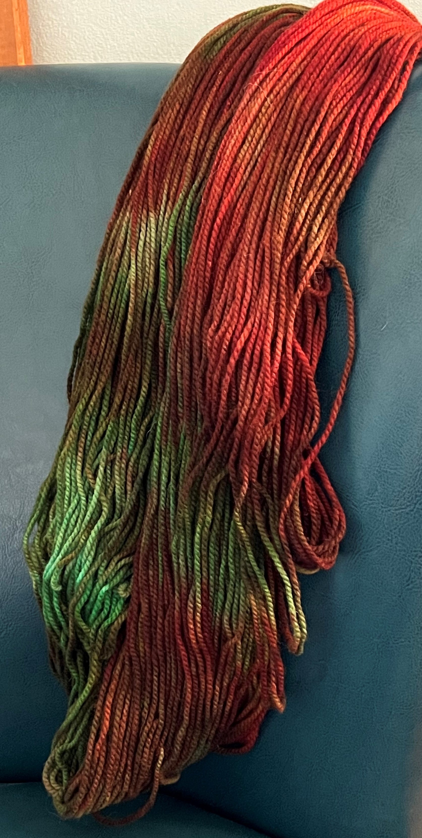 207 yards of bulky weight 3 ply yarn in shades of rust, brown and green. Hand-dyed for lightfastness and no bleeding. Make a pretty and warm hat by knitting or crocheting. Can also be woven.