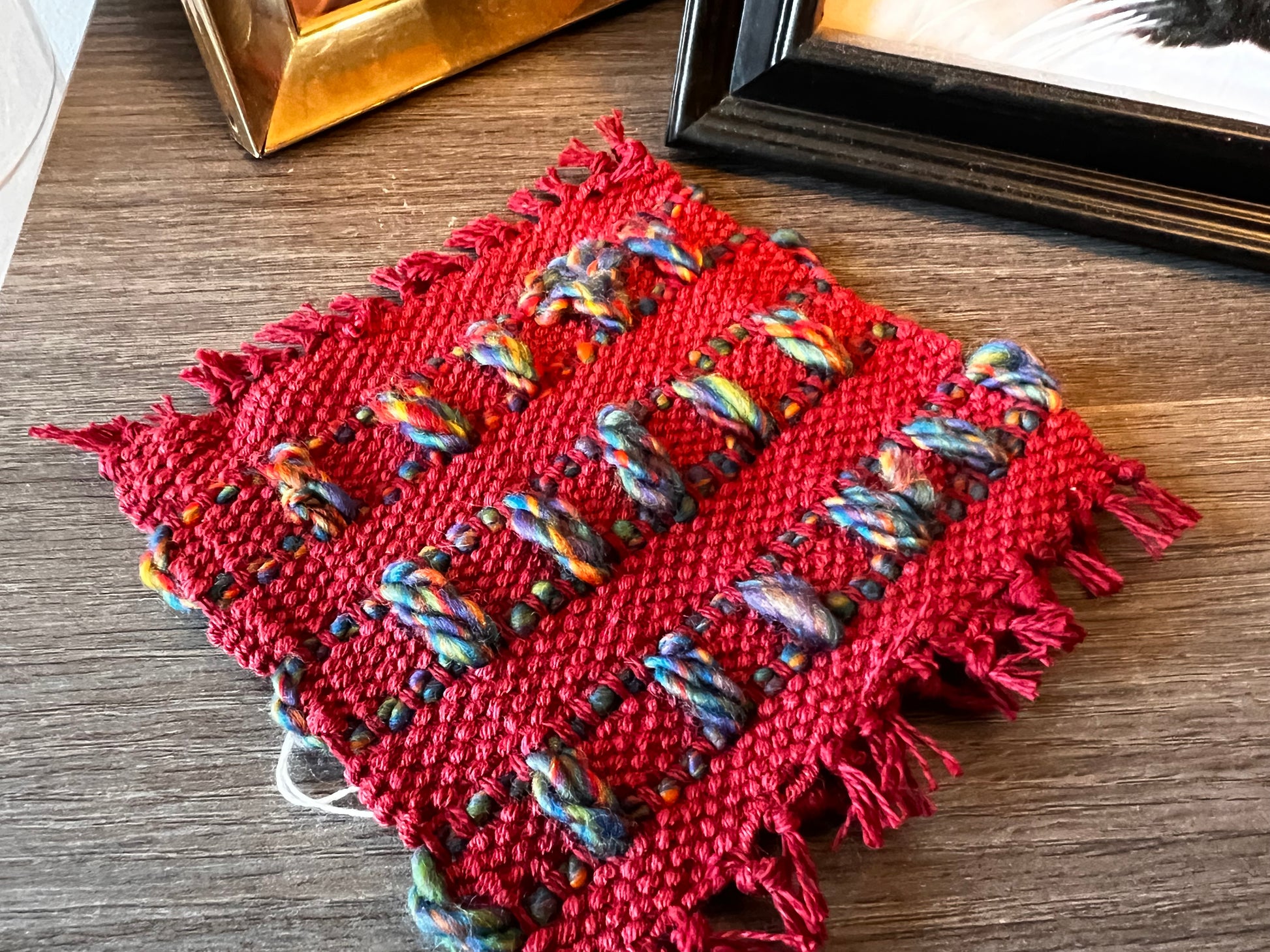 Woven red cotton decorated with variegated wool. Absorbent and decorative.