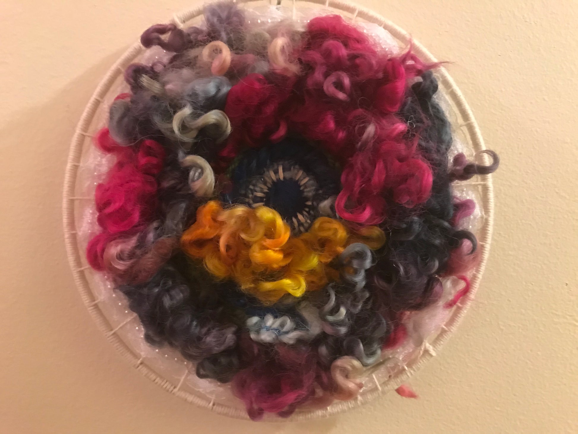 Circular Wall Hanging woven from all natural fibers. Conveys the welcome of a summer garden. Great gift for anyone who loves colorful flowers. The approximately 8" diameter will enable this weaving to adorn a small space on the wall that longs for something unique. One of a kind.
