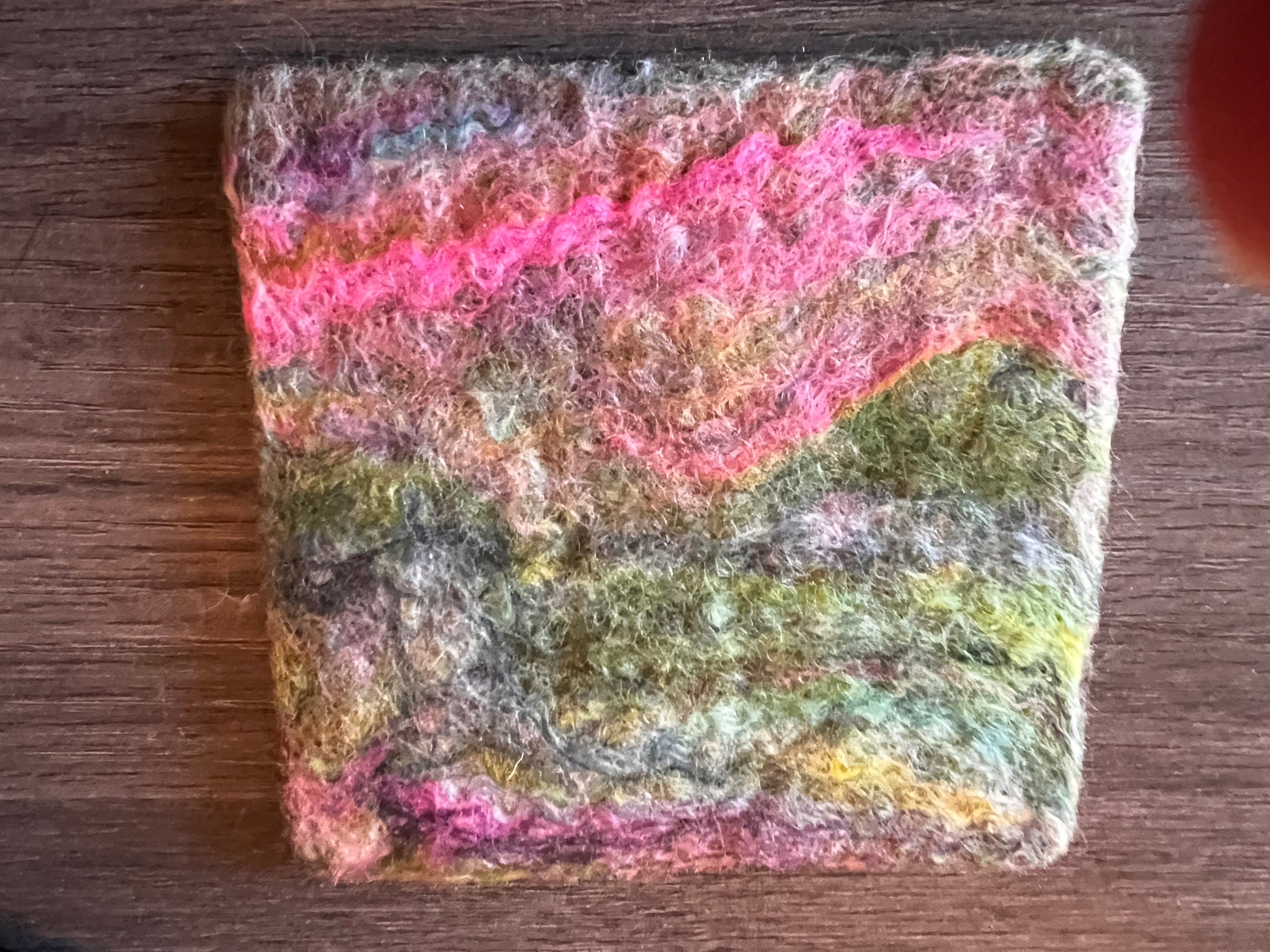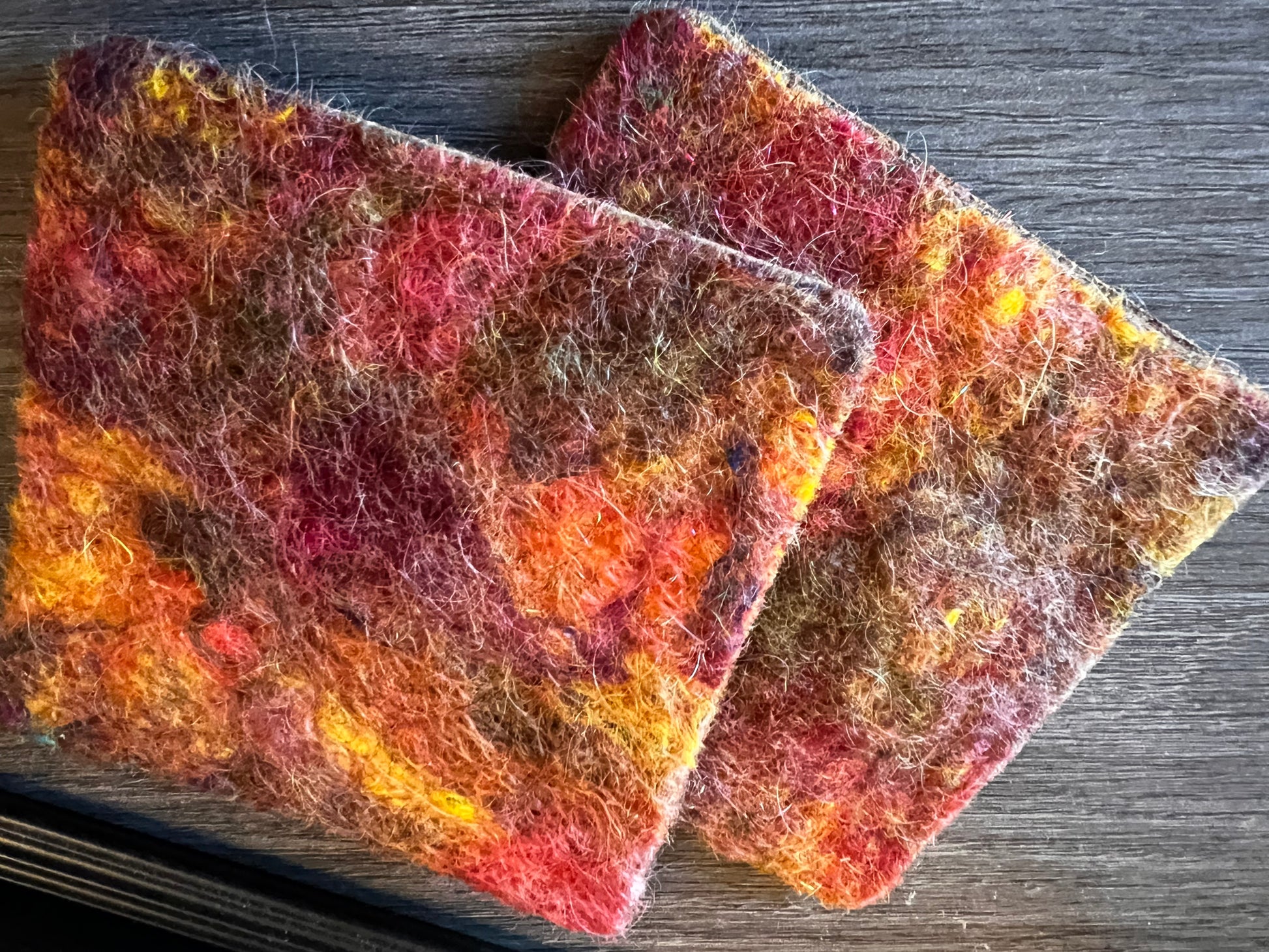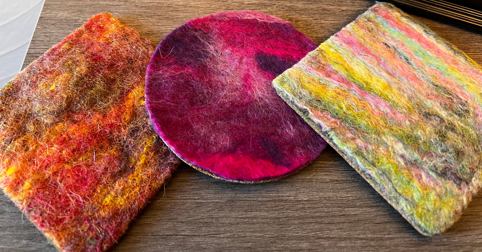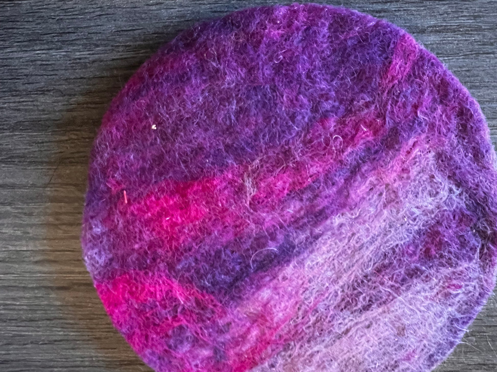Felted coaster mounted on cork will keep your table dry and add color. Non-scratch.