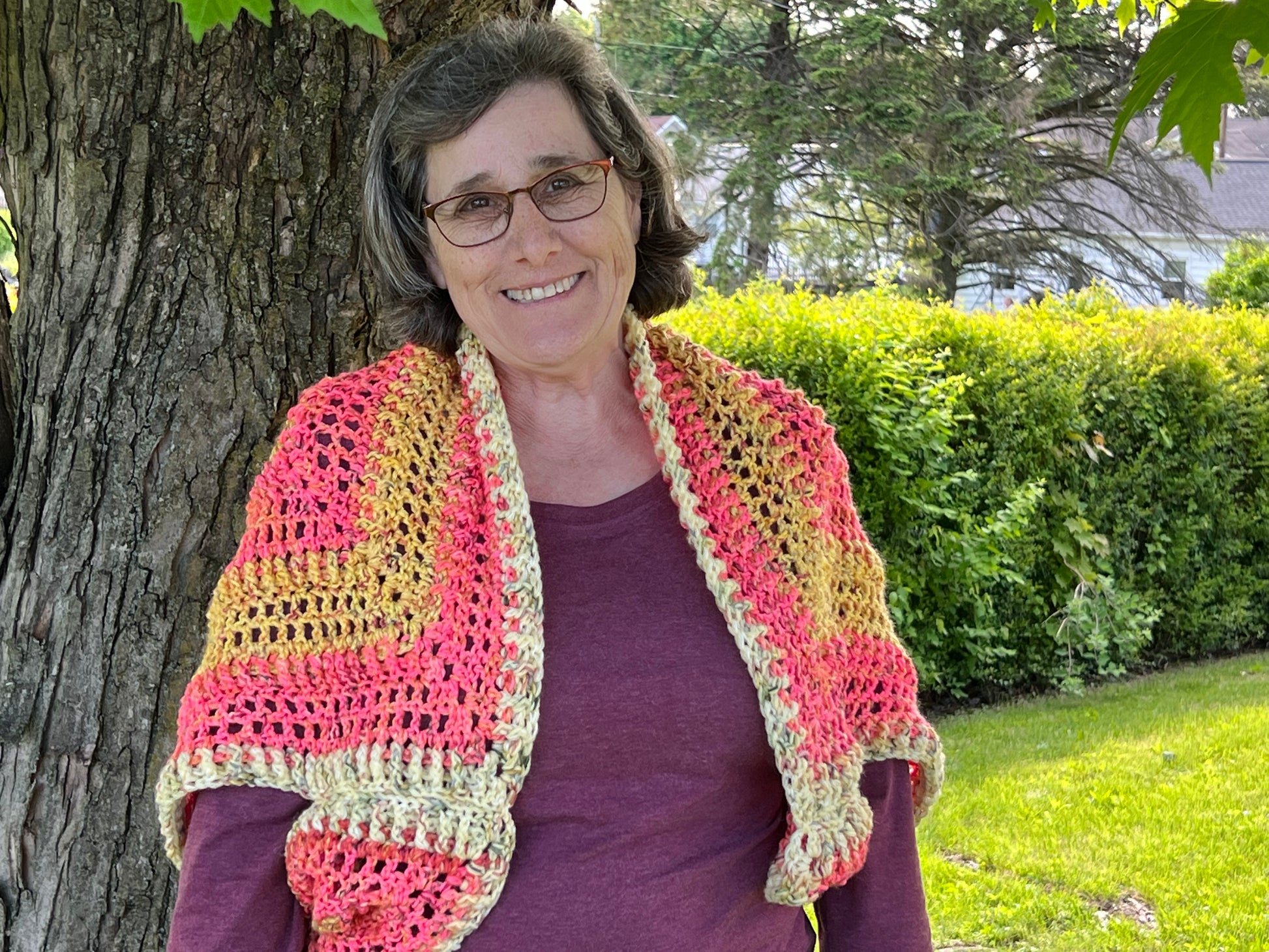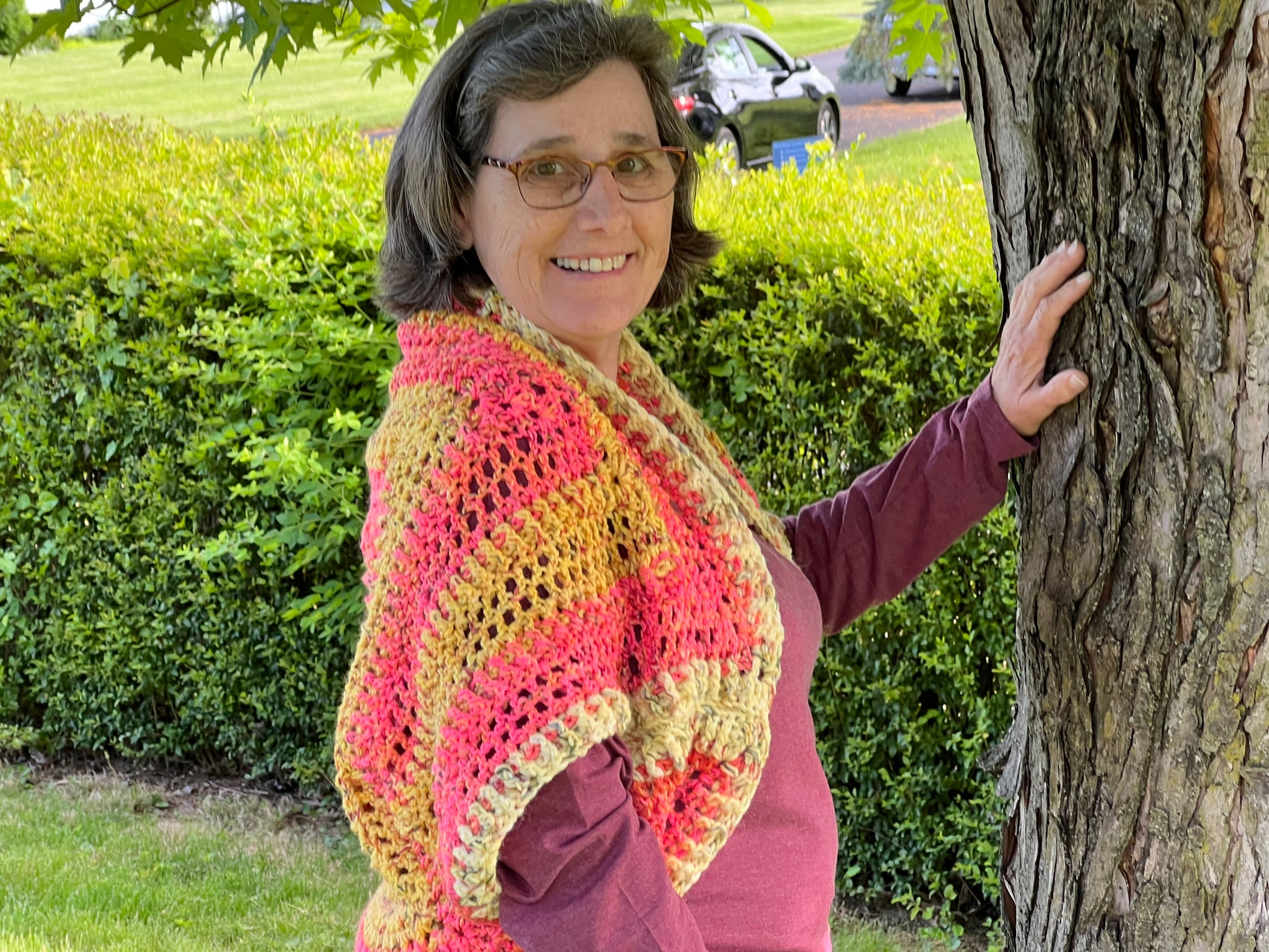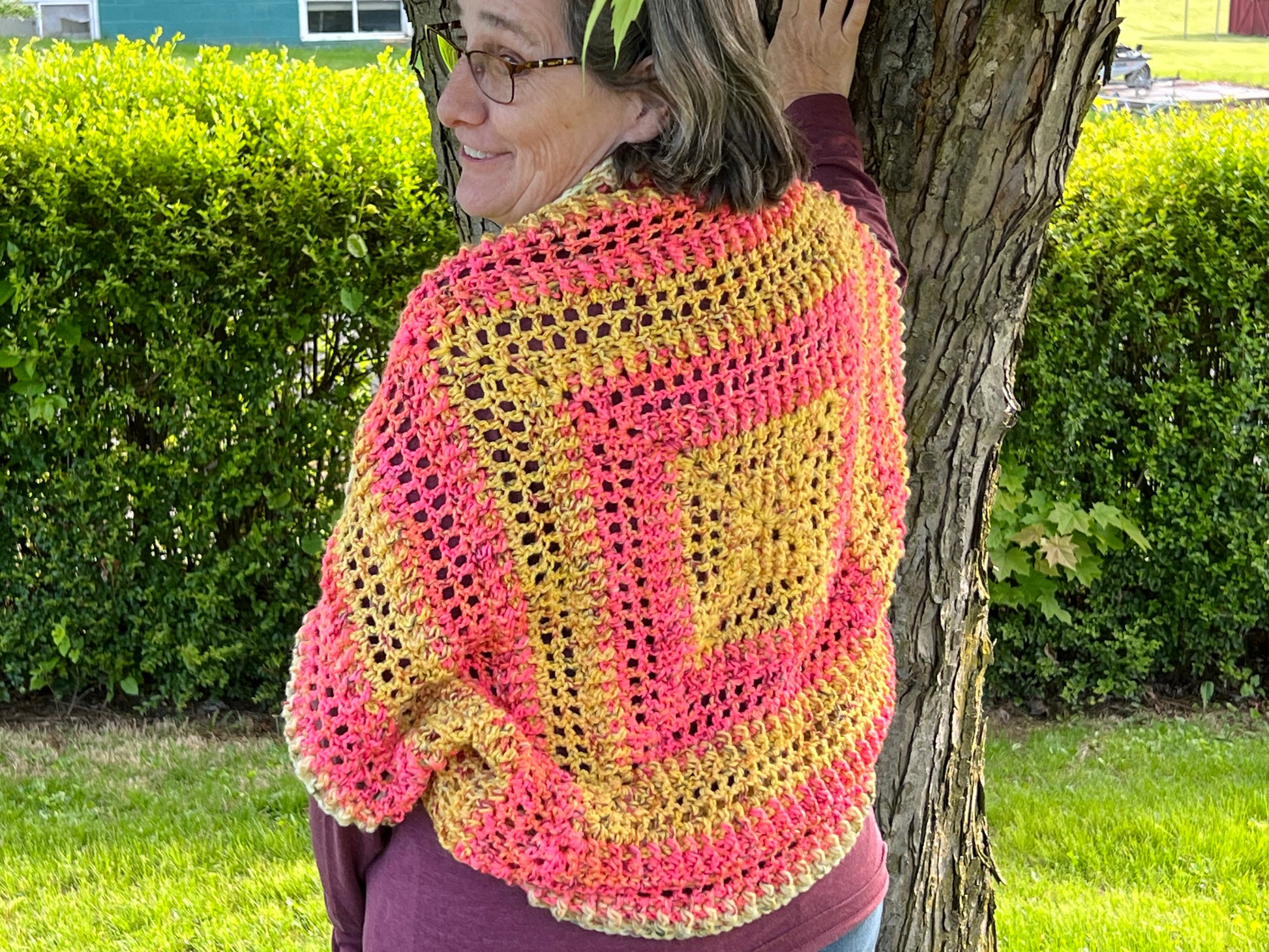 Soft Merino will keep you warm on the chilly nights of spring and summer. Crochet by hand. This garment was made to fit someone who wears medium to large sizes measuring 38" across the back from elbow to elbow. Cheerful colors with brighten any day.