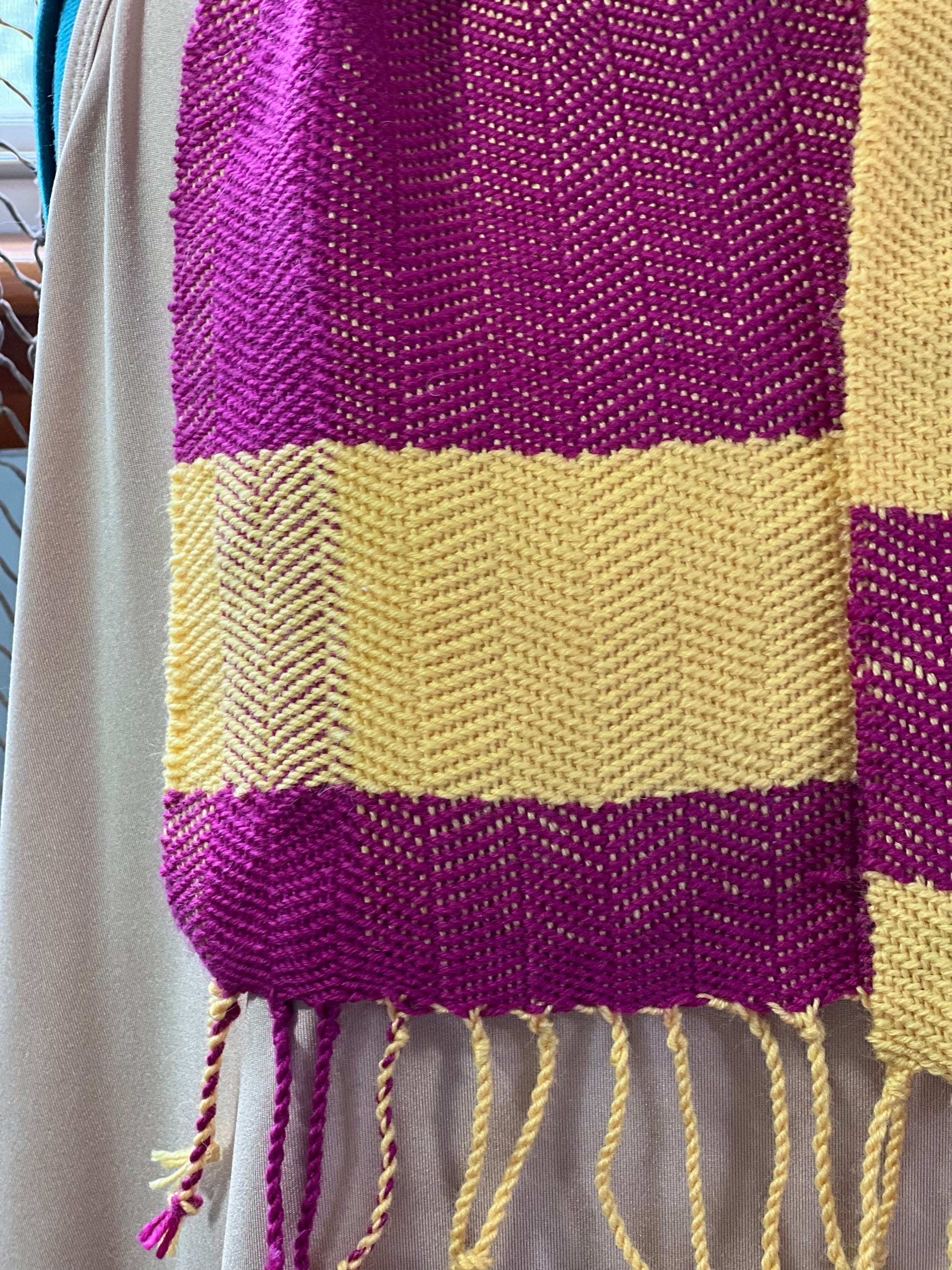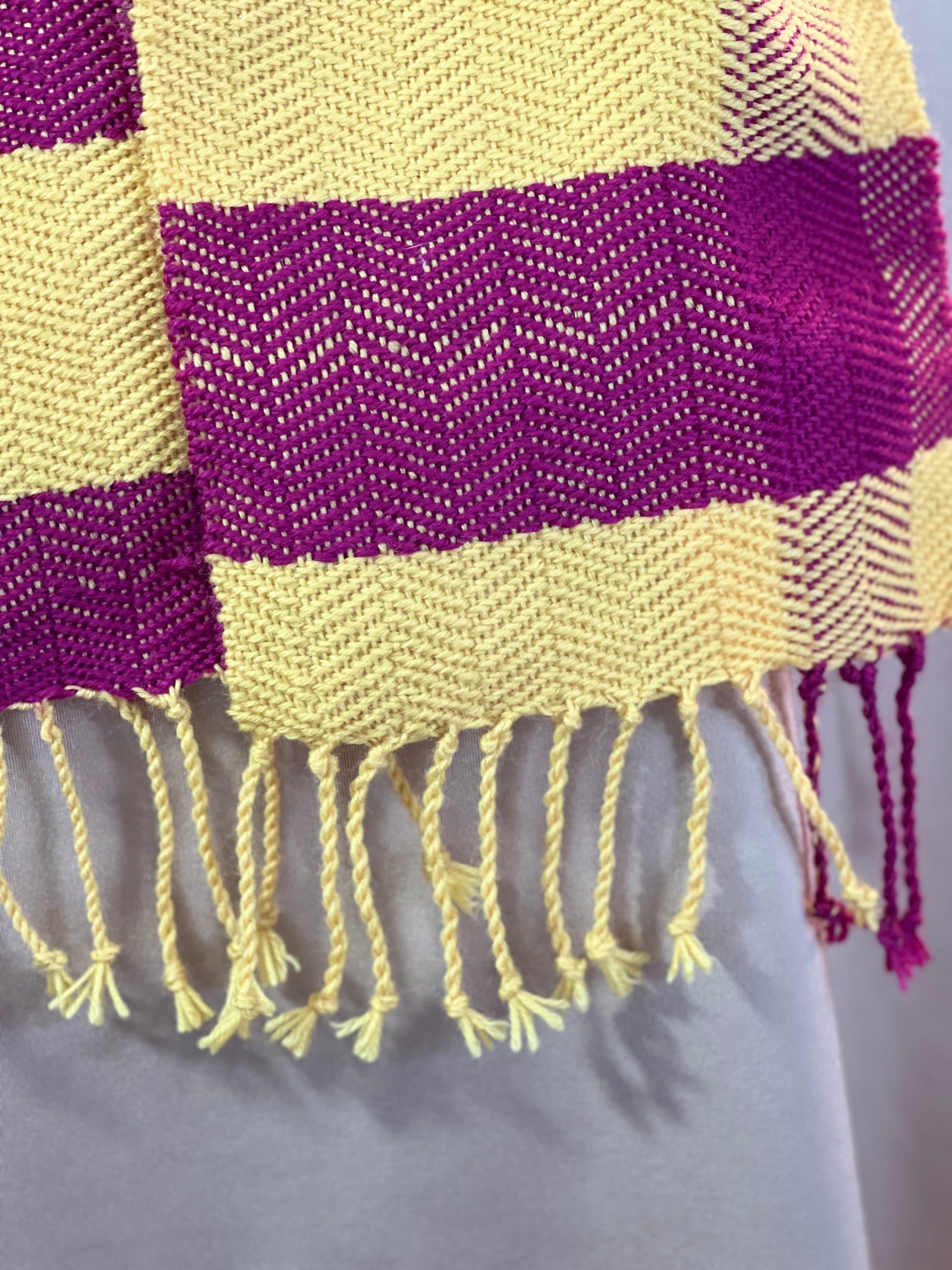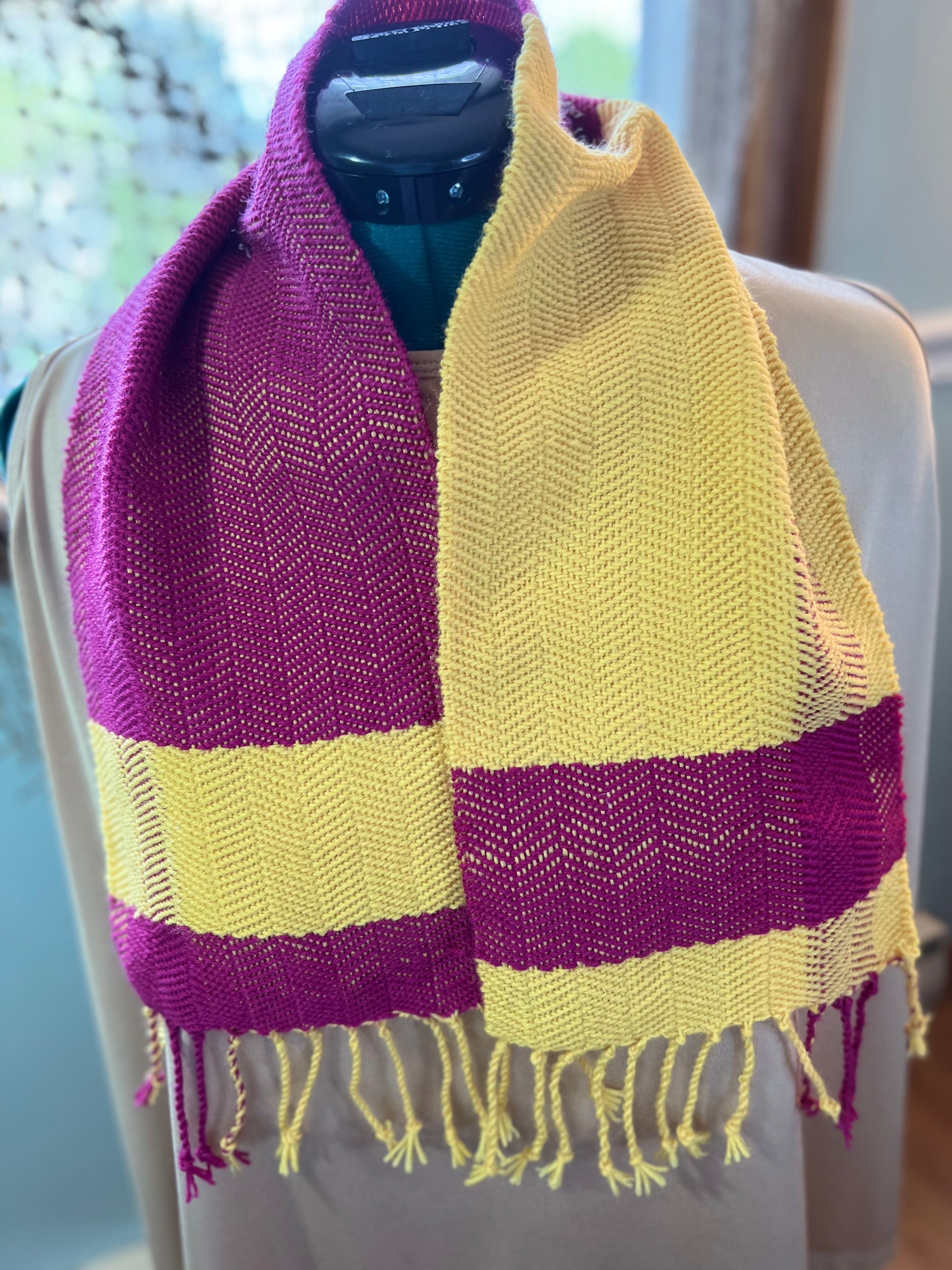 Yellow and dark pink Merino were used to weave this scarf. On the short size (36" long), it would work well as a neck warmer in addition to a scarf. It is 8" wide and the tasels adds 3 additional inches on each end of the scarf. Very soft thanks to the Merino wool.