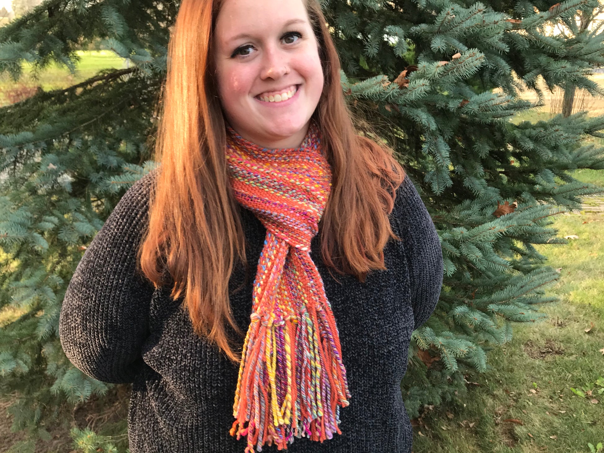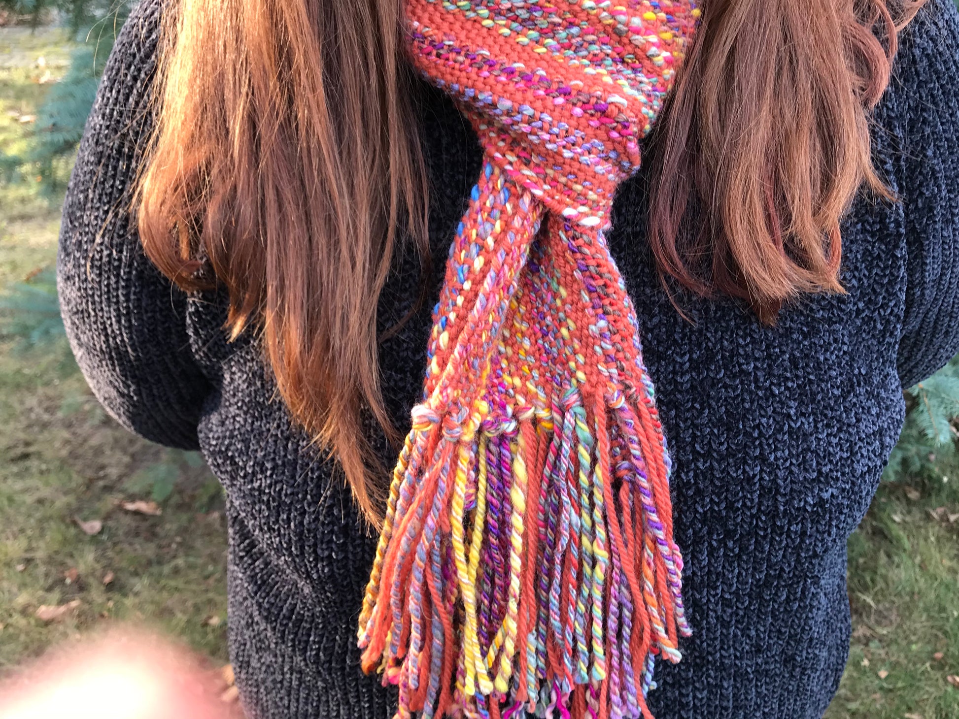 Multicolored hand spun accents the burnt orange background of this alpaca/silk/wool scarf. Luxuriously soft with easy drape. This scarf lends itself to being worn in numerous ways thanks to its 64”. (Plus fringe) length and 6” width.