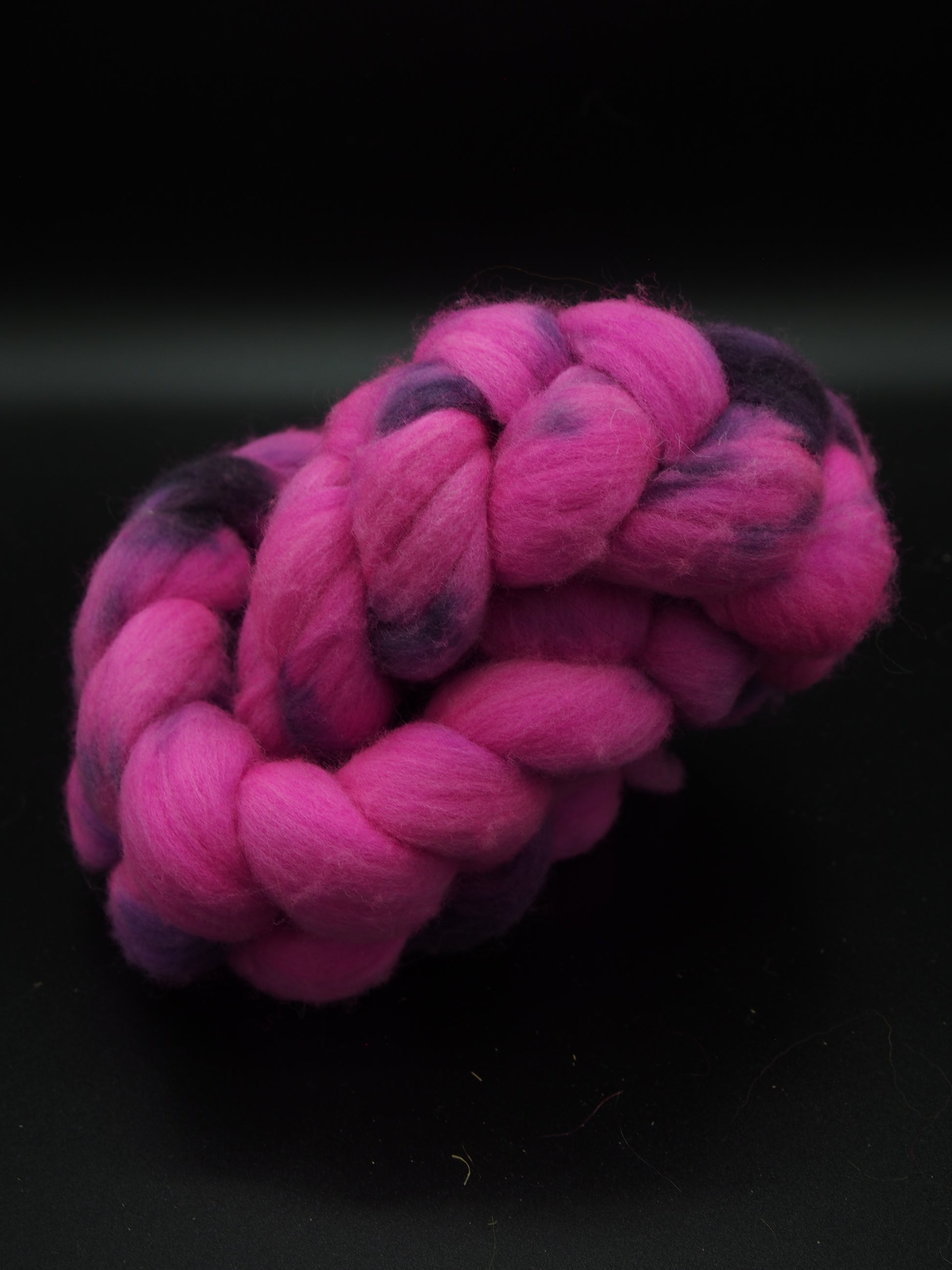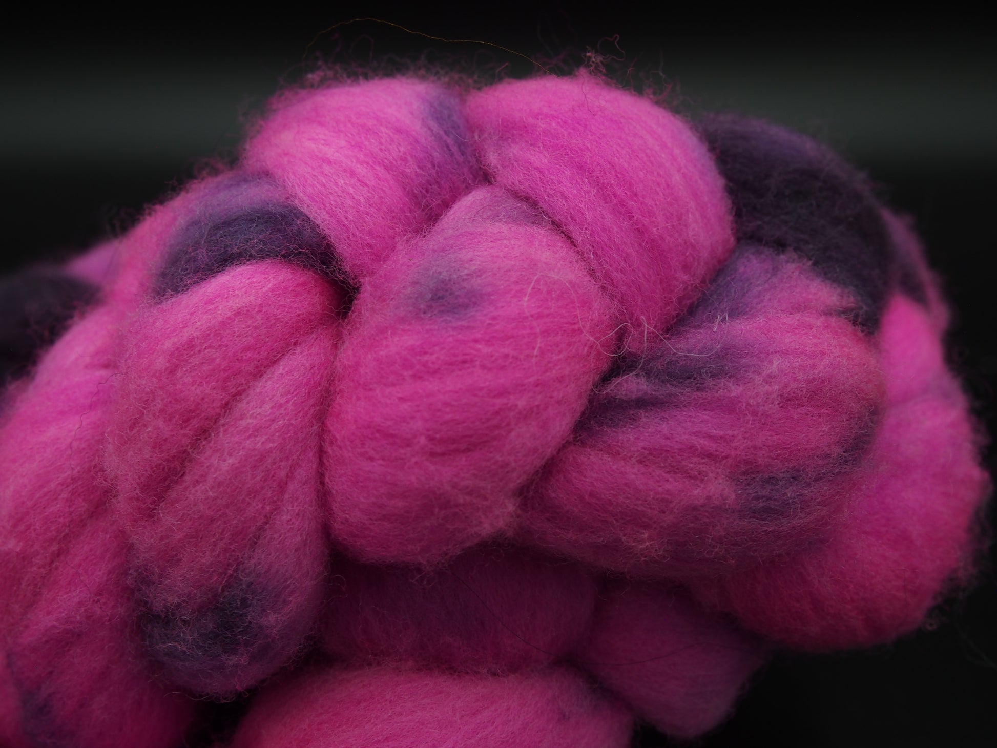 Corriedale Pink and Purple Lovely soft fiber. Expertly dyed not to bleed. Easy to spin and can be used for felting as well.