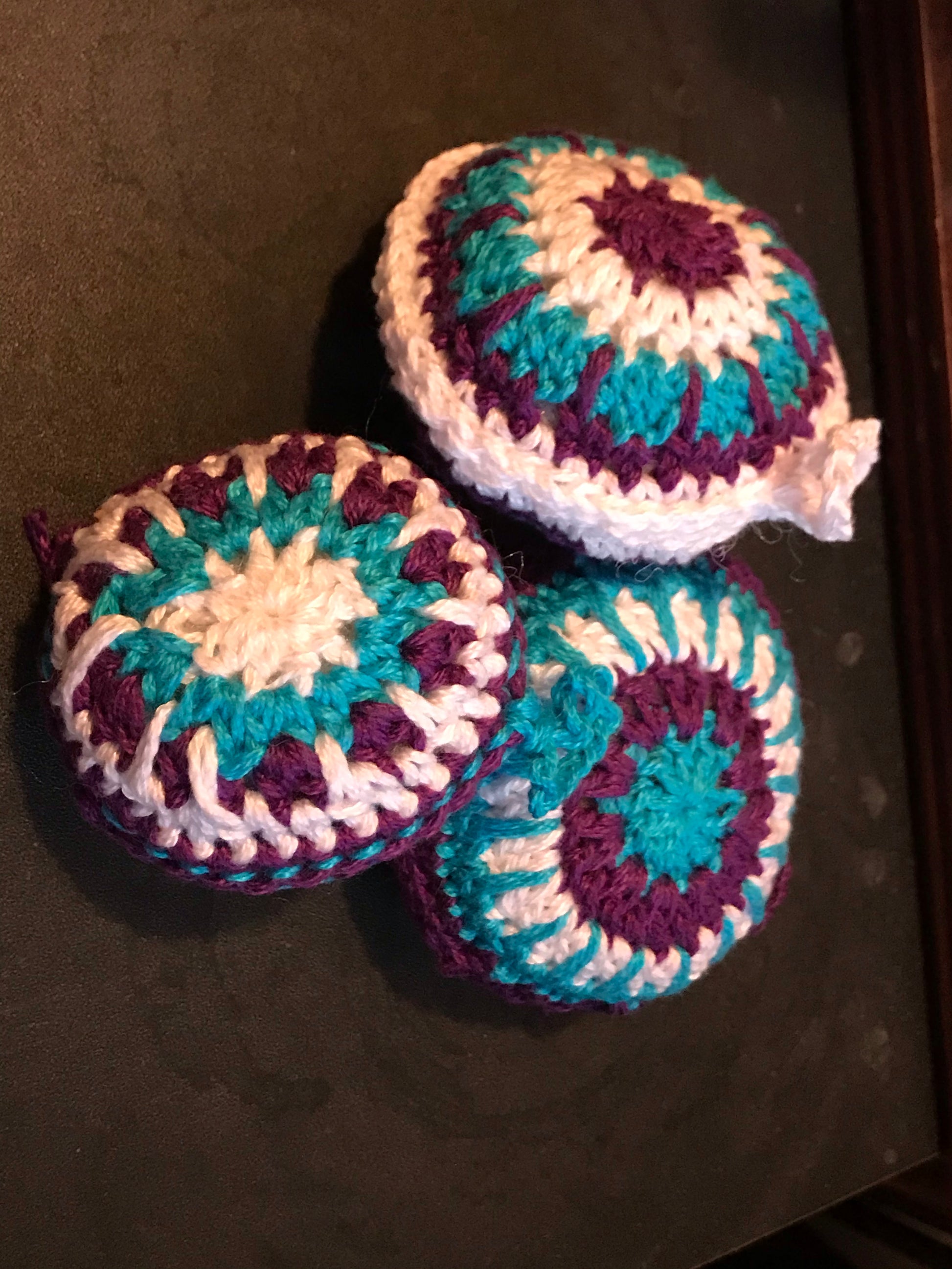 Set of three crochet ornaments. Three sizes and designs using the same colors. Light weight.