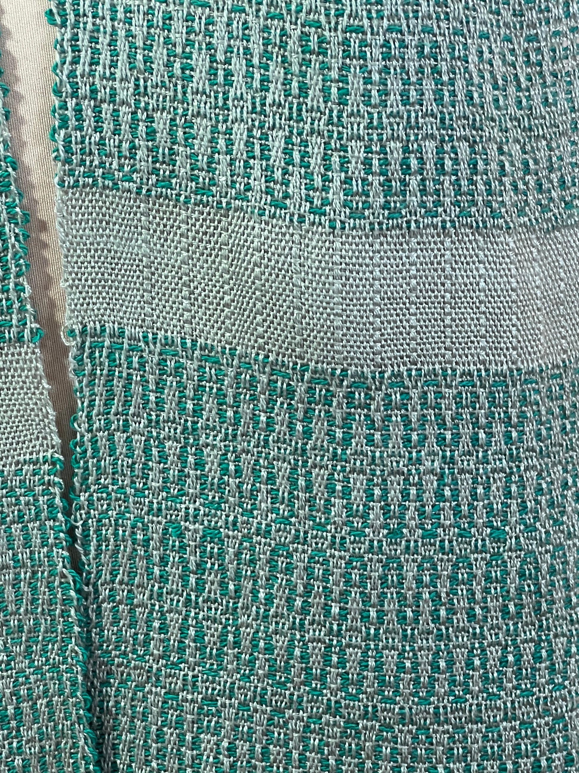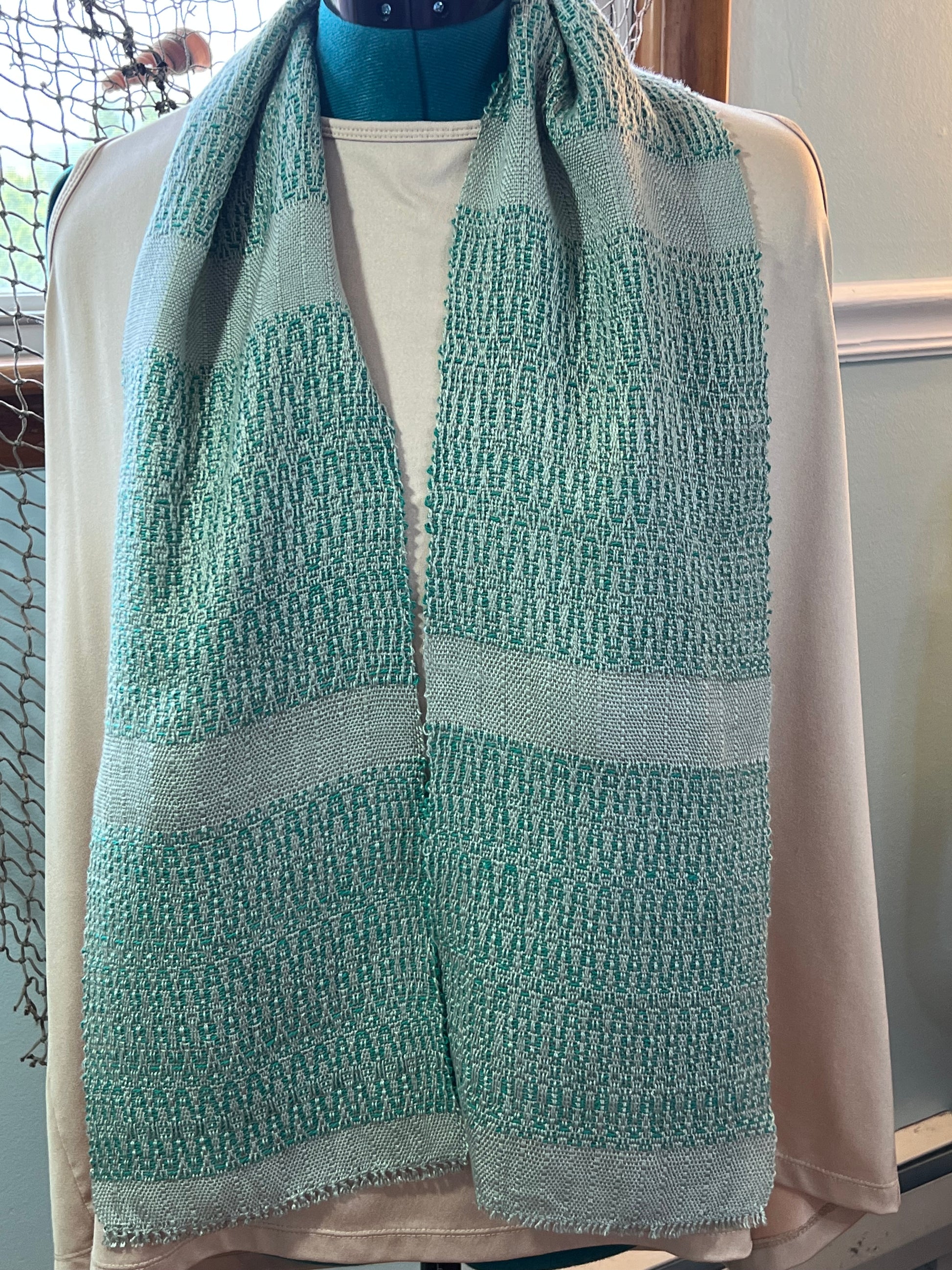 Delicate overshot pattern. Cotton on a background of bamboo. Light weigh with good drape. Length 58". Width 7.5".