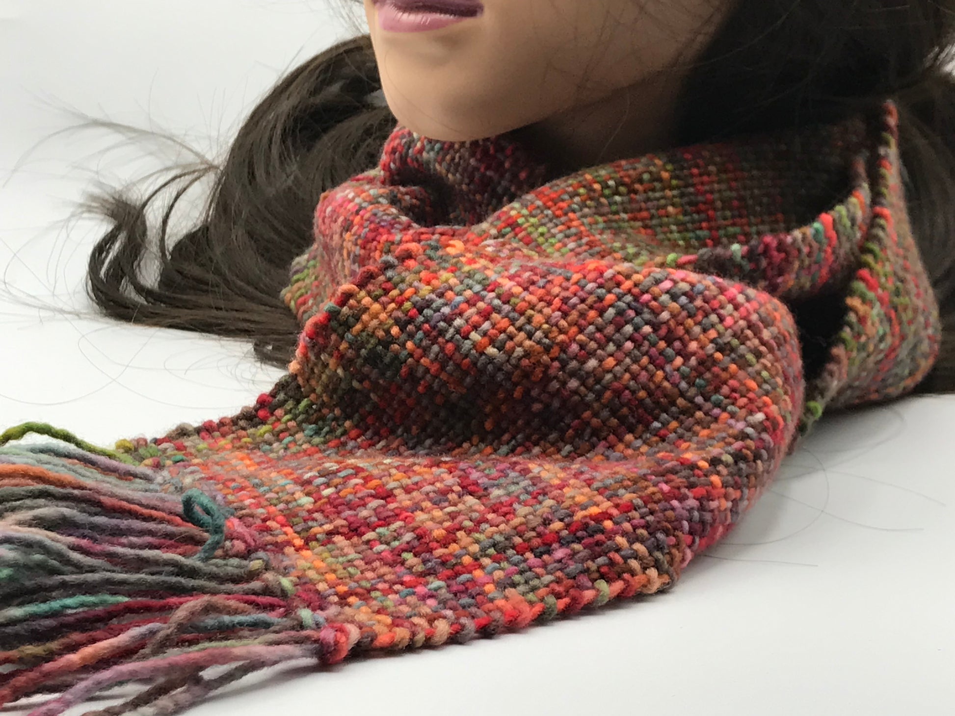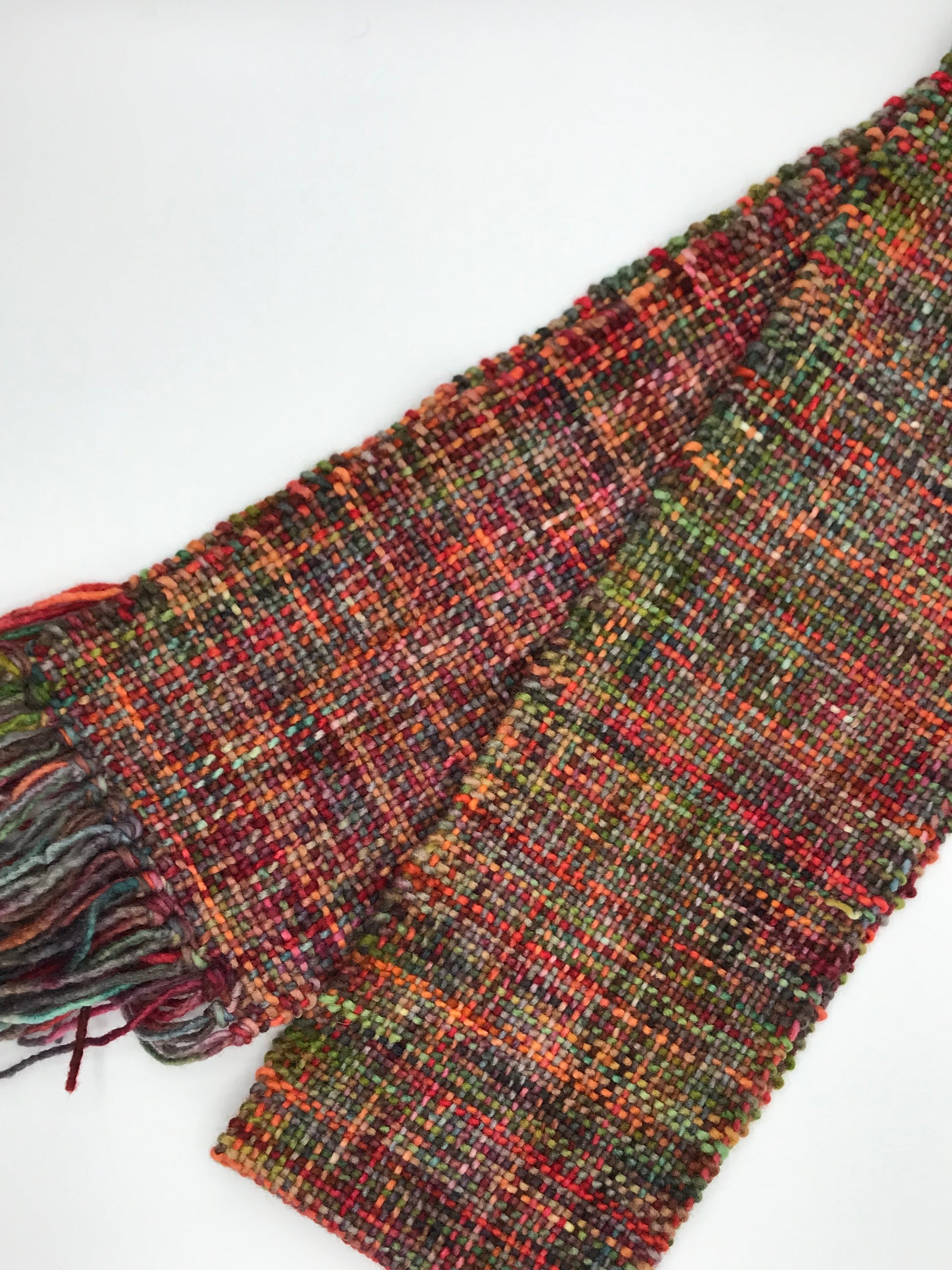 Lovely Blue Face Leicester yarn was used in the weaving of this scarf giving it supple drape. One of a kind. 68" long (plus fringe) makes the scarf long enough to fold and wear in a number of styles. 5 1/2" wide.