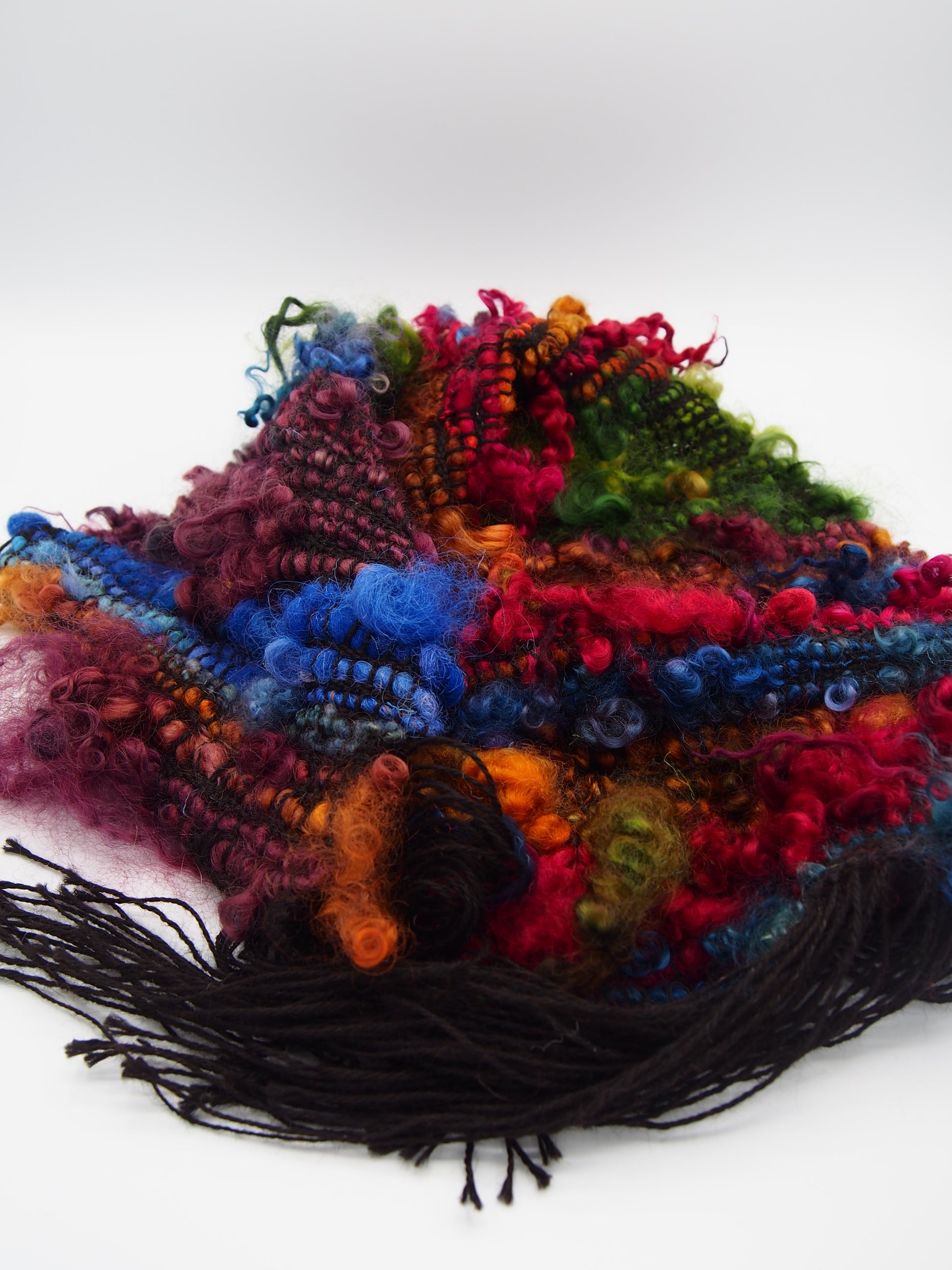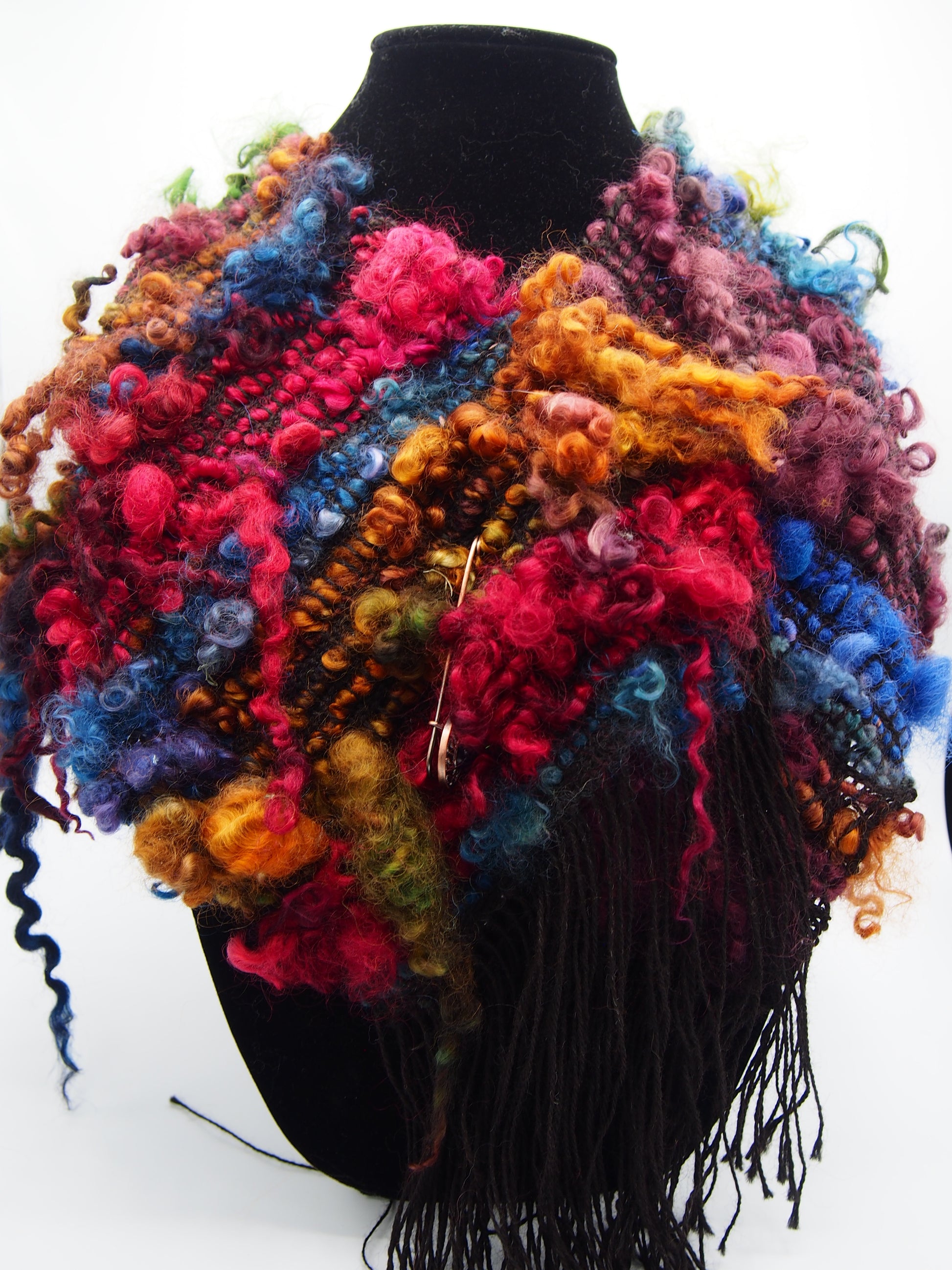 One-of-a-king! Colorful, luxurious , hand spun and woven. Use attached hock or a shawl pin (not included) to close over your coat. Can also be use as an accessory over a dress or blouse. Add warmth and color to your neckline. Wool and Alpaca, next to skin soft.