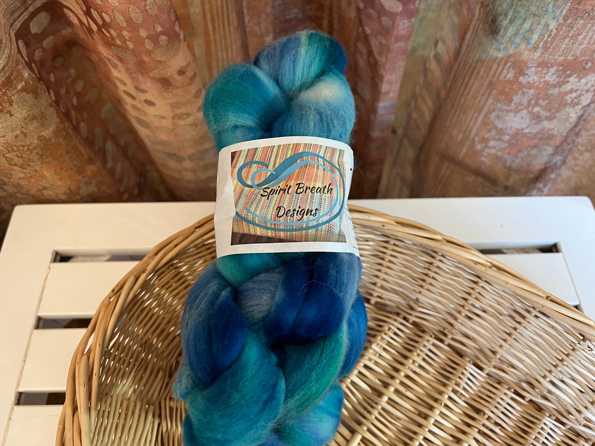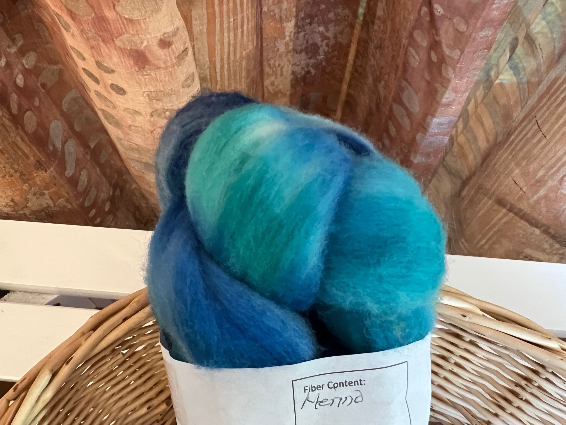 Expertly dyed and extremely soft fine wool. Merino is the top of the line. You will love the feel of this fiber on your skin. Guaranteed not to bleed. Great for spinning or felting. 2.5 Oz. Shades of teal and blue.