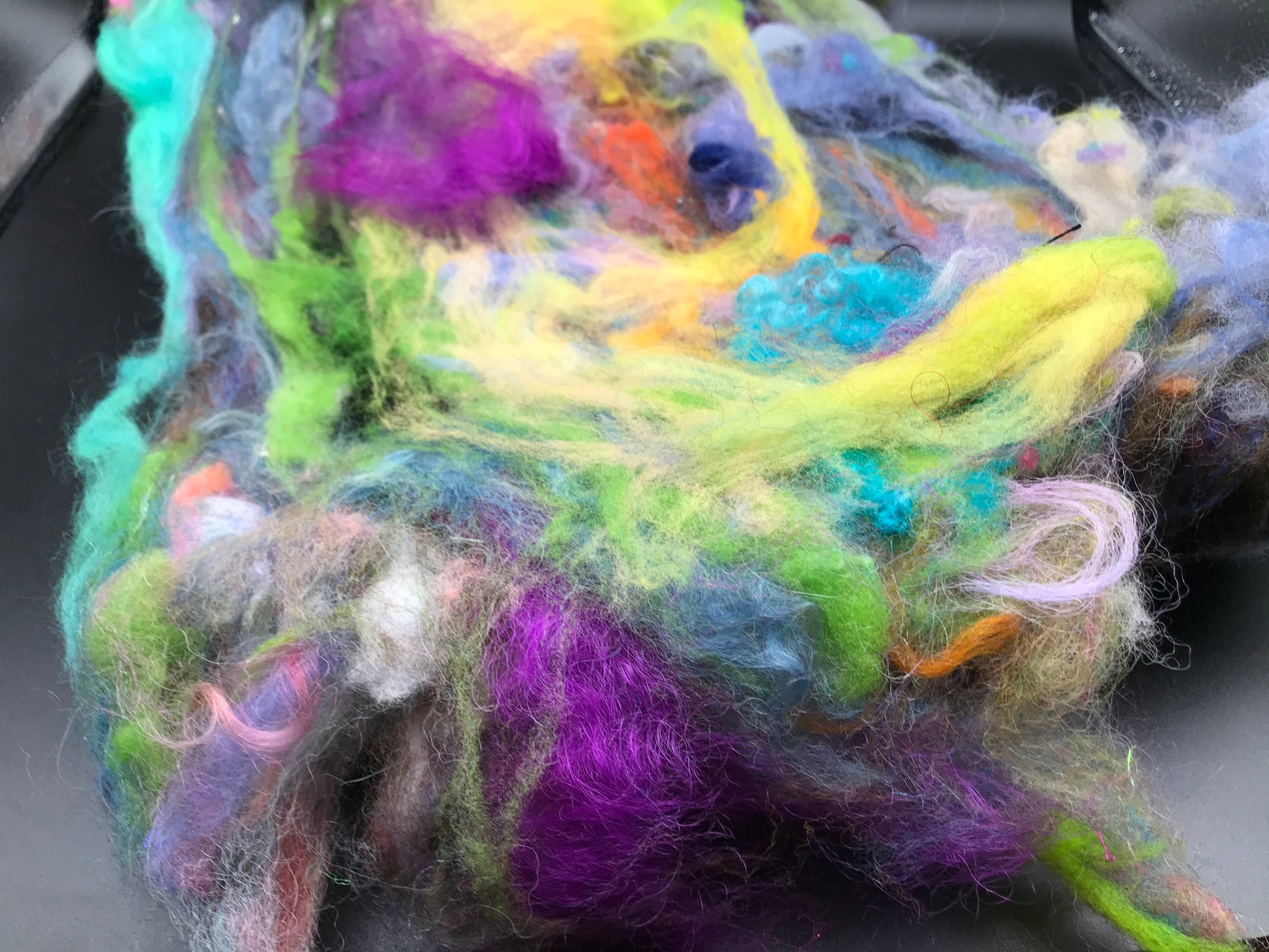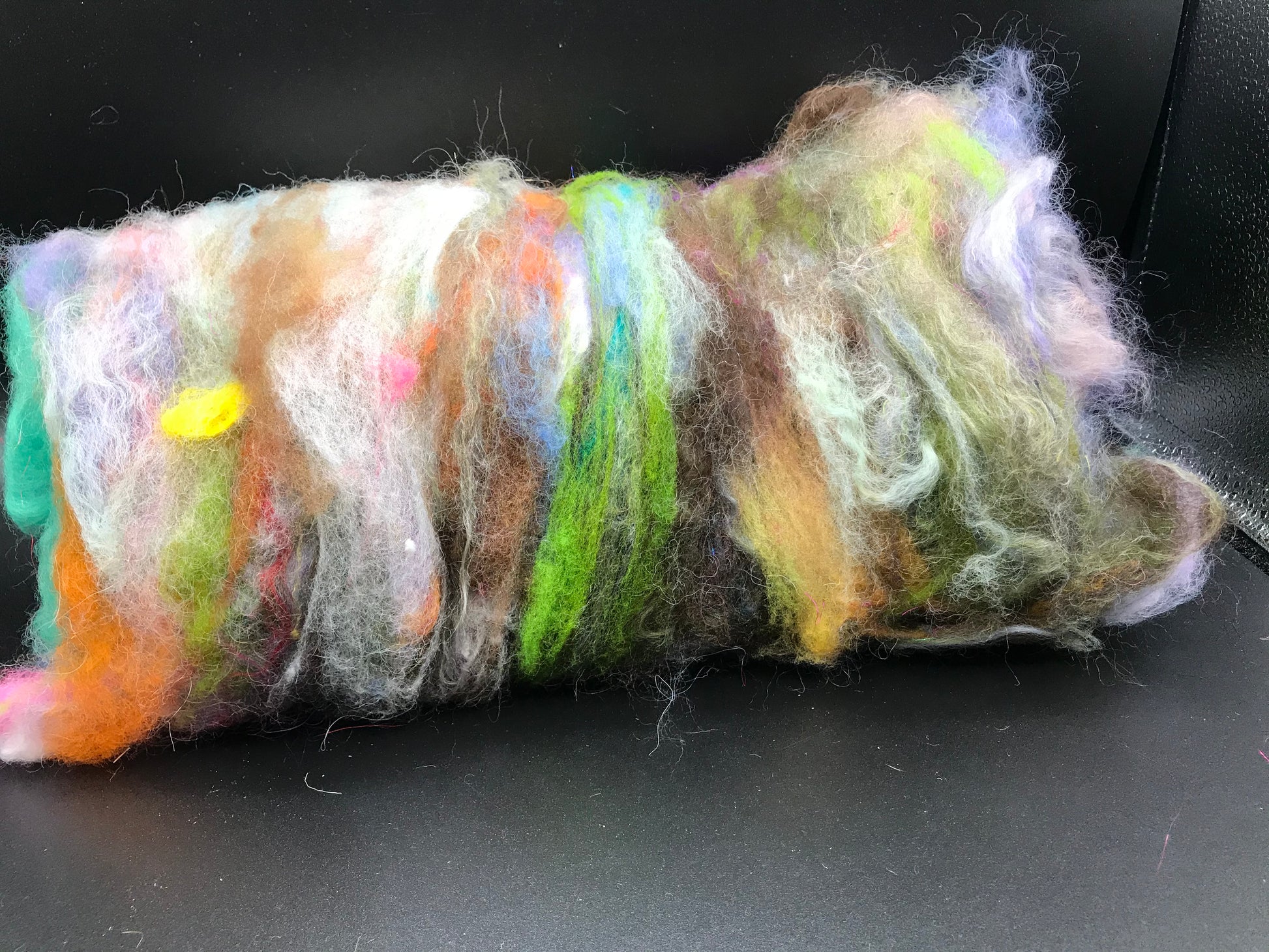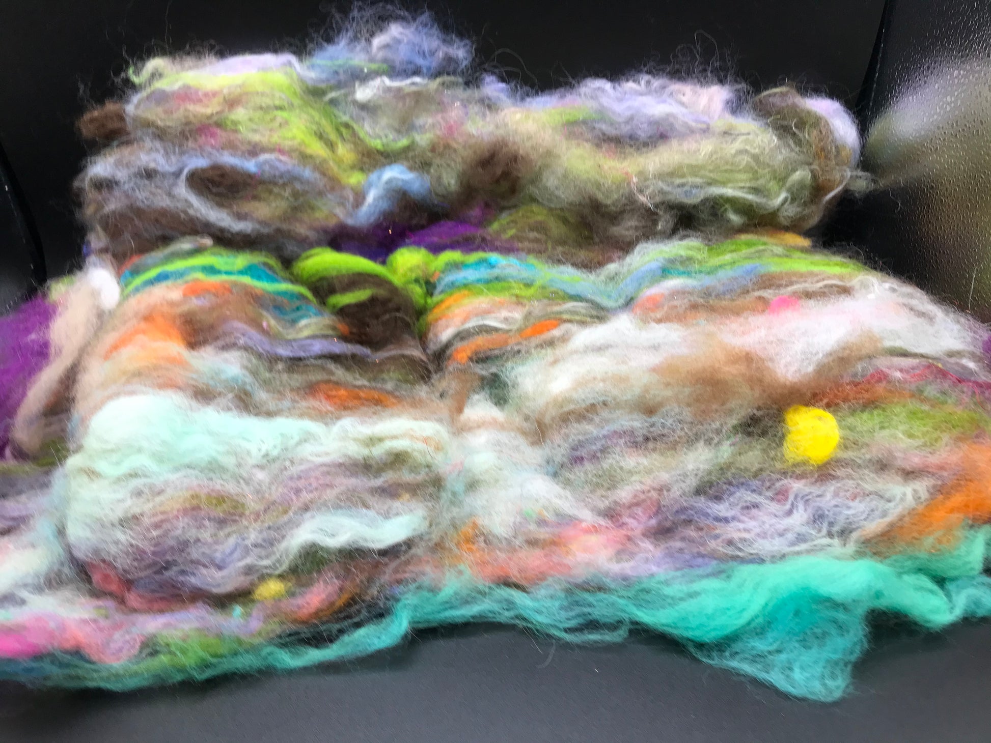 2 7/8 oz batt multicolored alpaca and wool. Slight texture. Would make a beautiful core-spun or felted project.