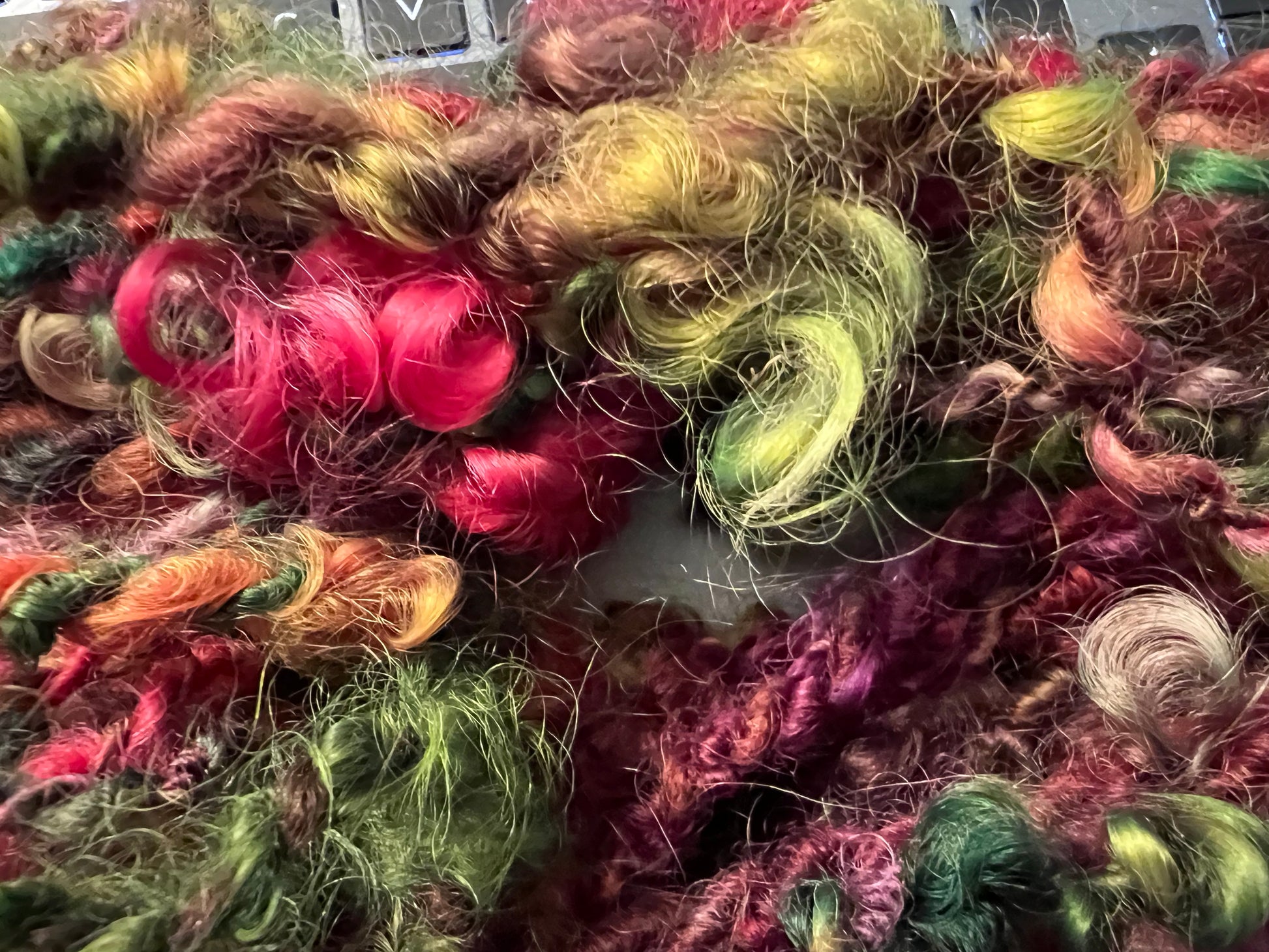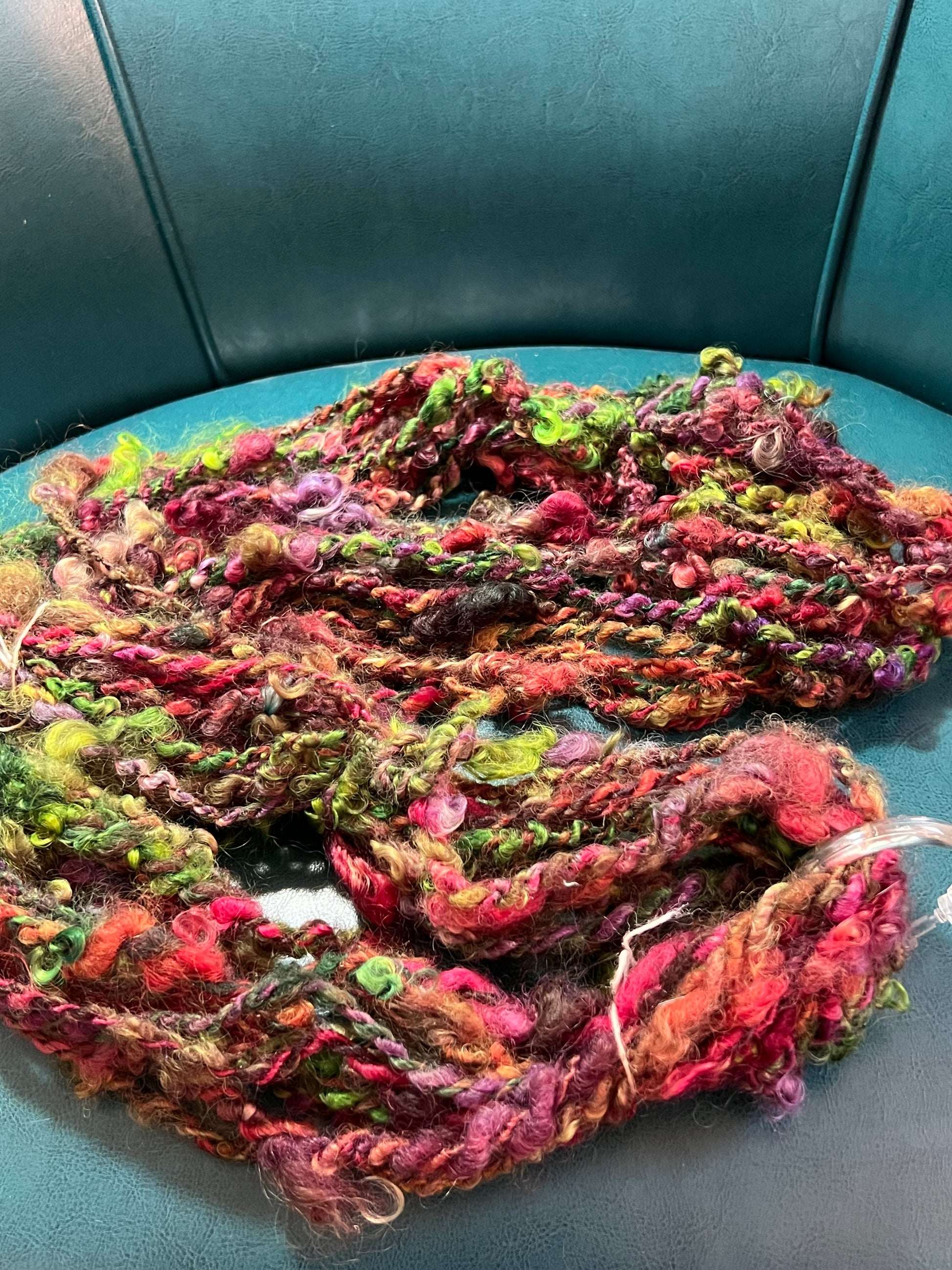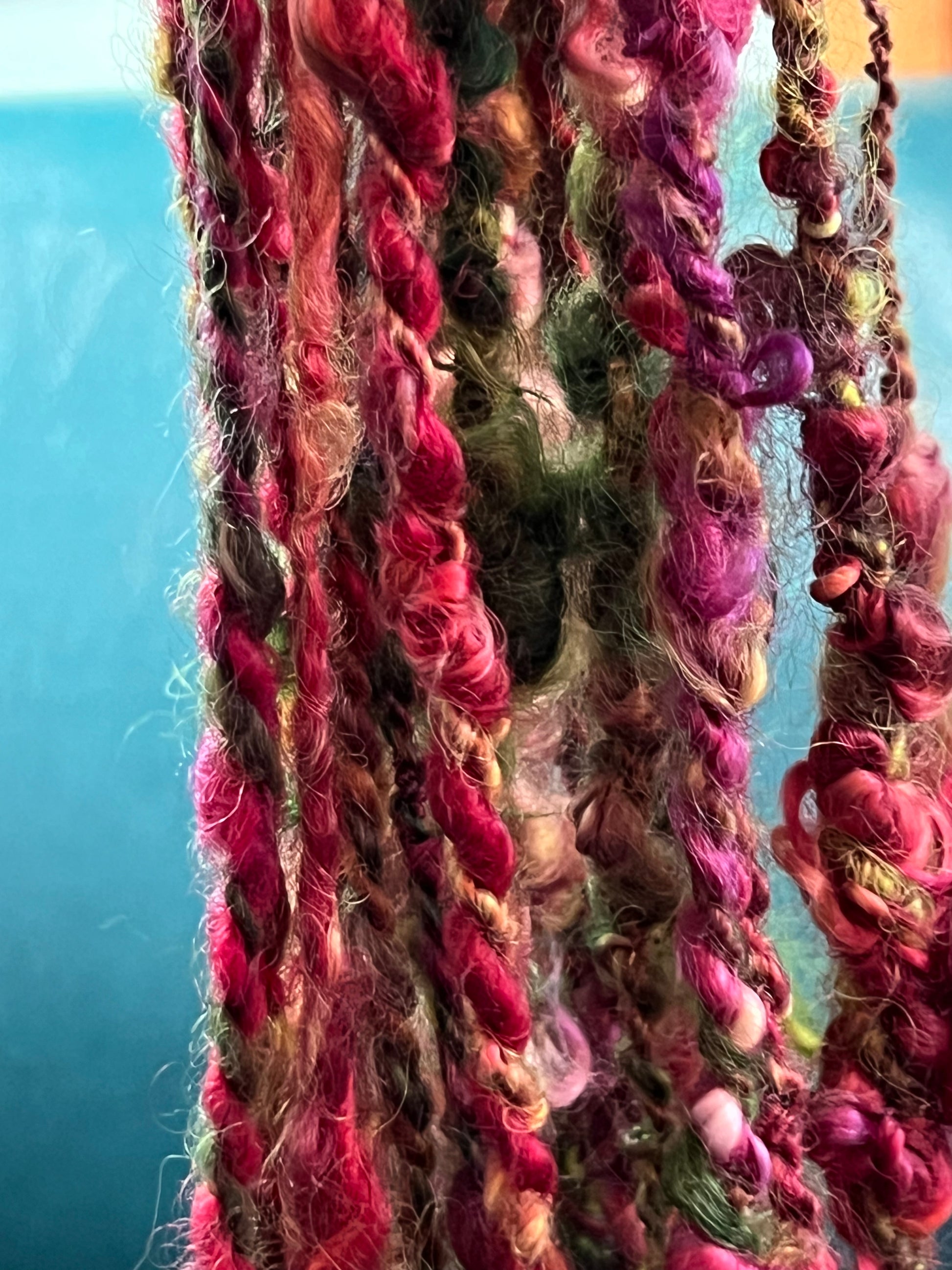 Hand Spun from locks of Teeswater, Wensleydale, and Mohair. This is a bulky weight yarn. Diameter of the yarn varies. 26 yards total.