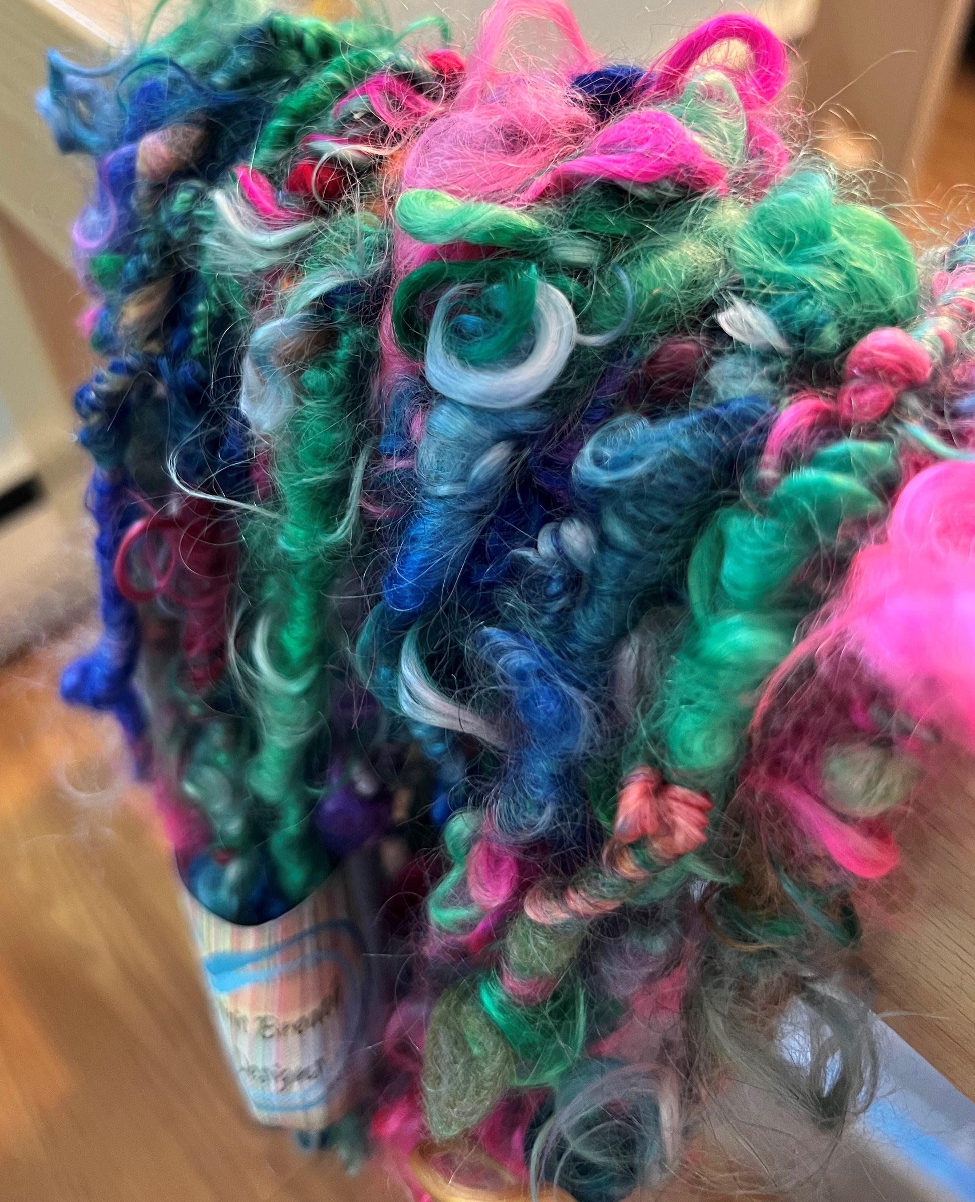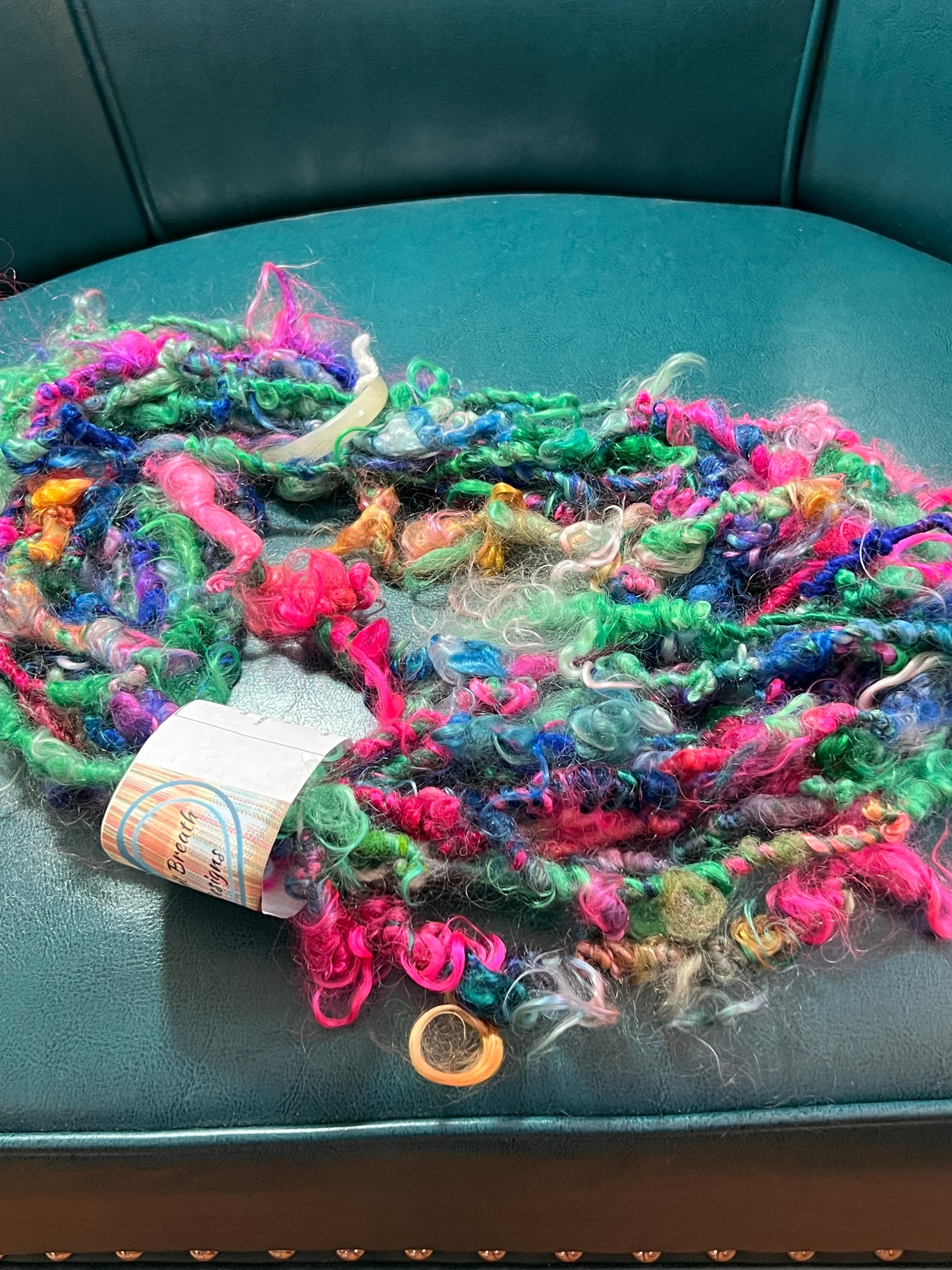 Hand spun Mohair locks in vibrant colors make up this ultra soft and shiny yarn. You have to feel it to appreciate it. Would be beautiful woven into a scarf as an accent. There are 16 yards in this skein.