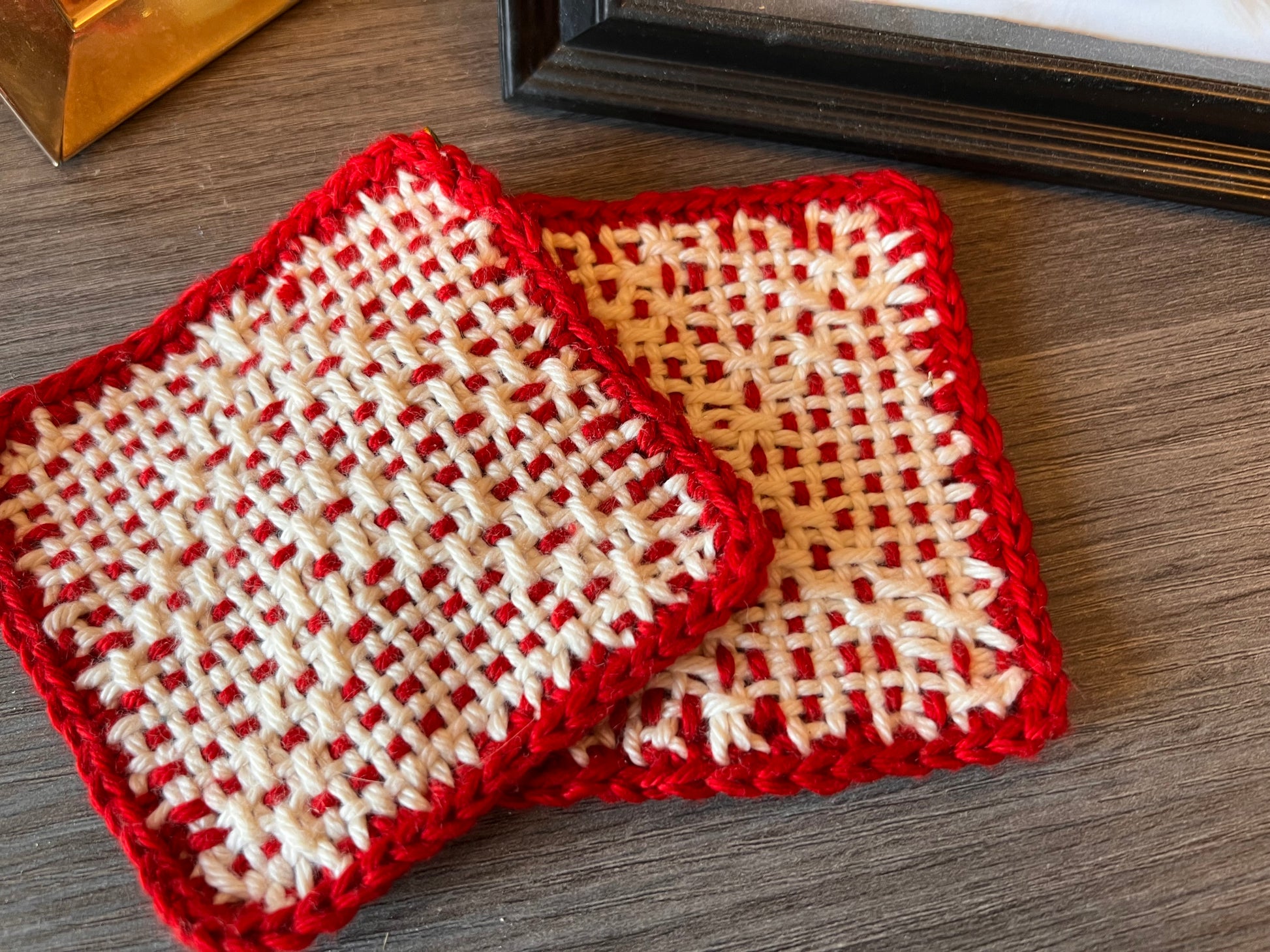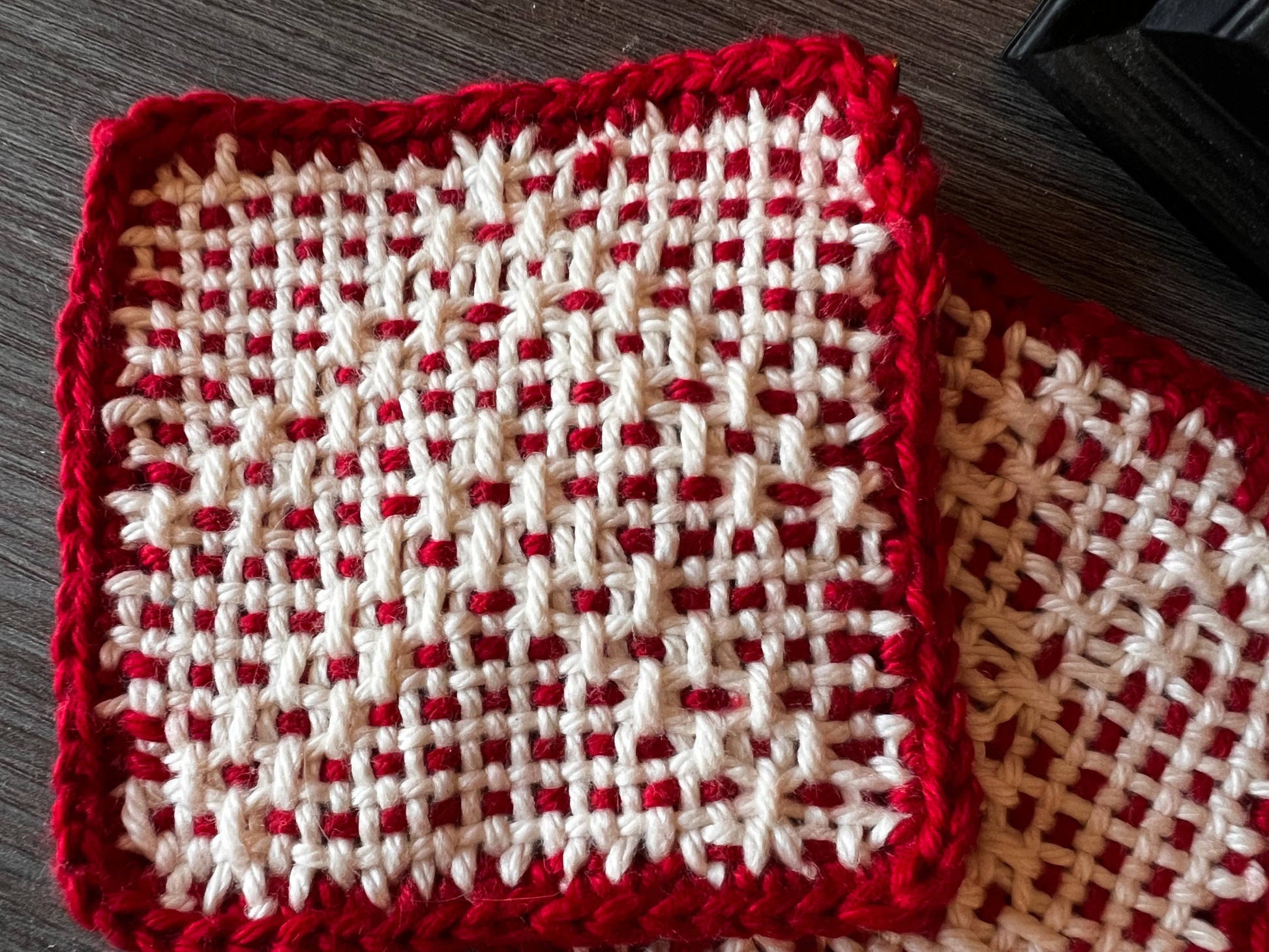 Woven of cotton in red and white. Abstract Christmas Tree woven into side one design. Side 2 solid red. Heavy and durable. Protects your tables. Set of 2.