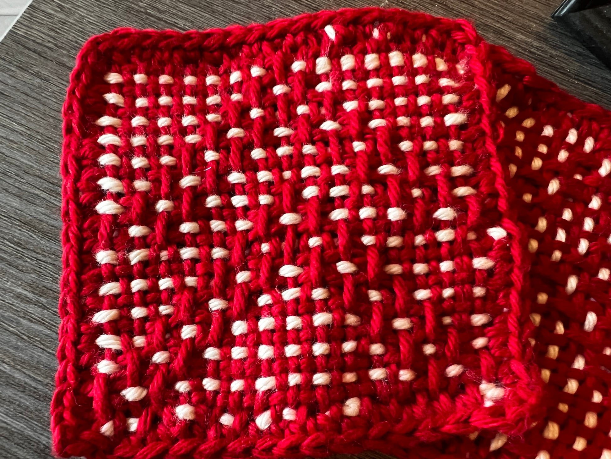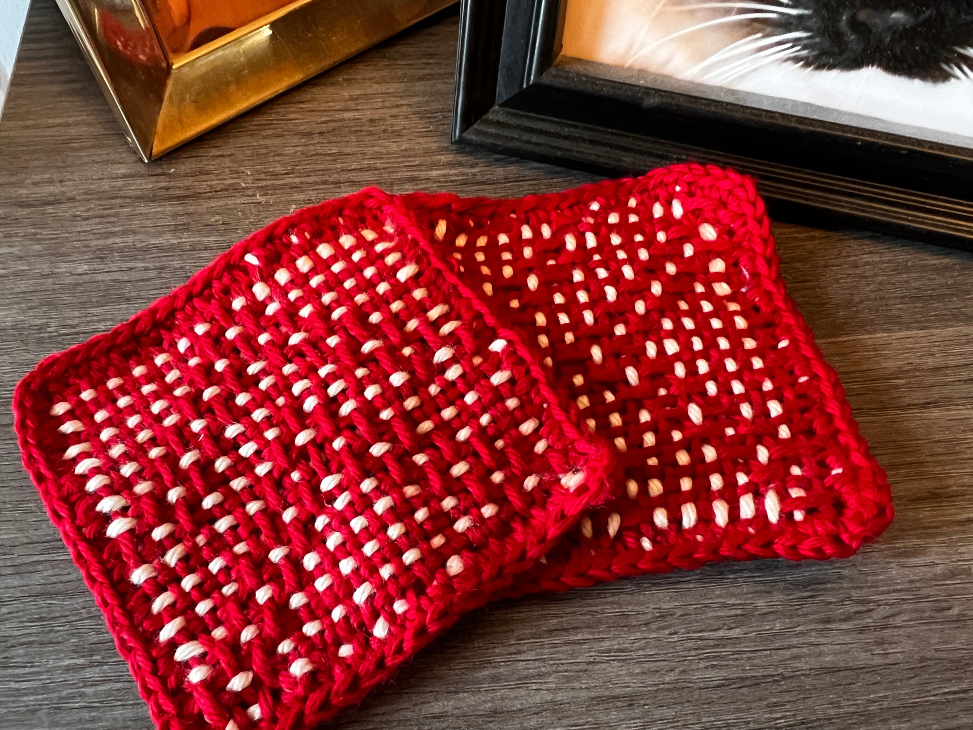 Double thickness woven cotton mug rug. Sturdy and absorbent. Side one has abstract tree image. Side two is solid red. Set if 2.