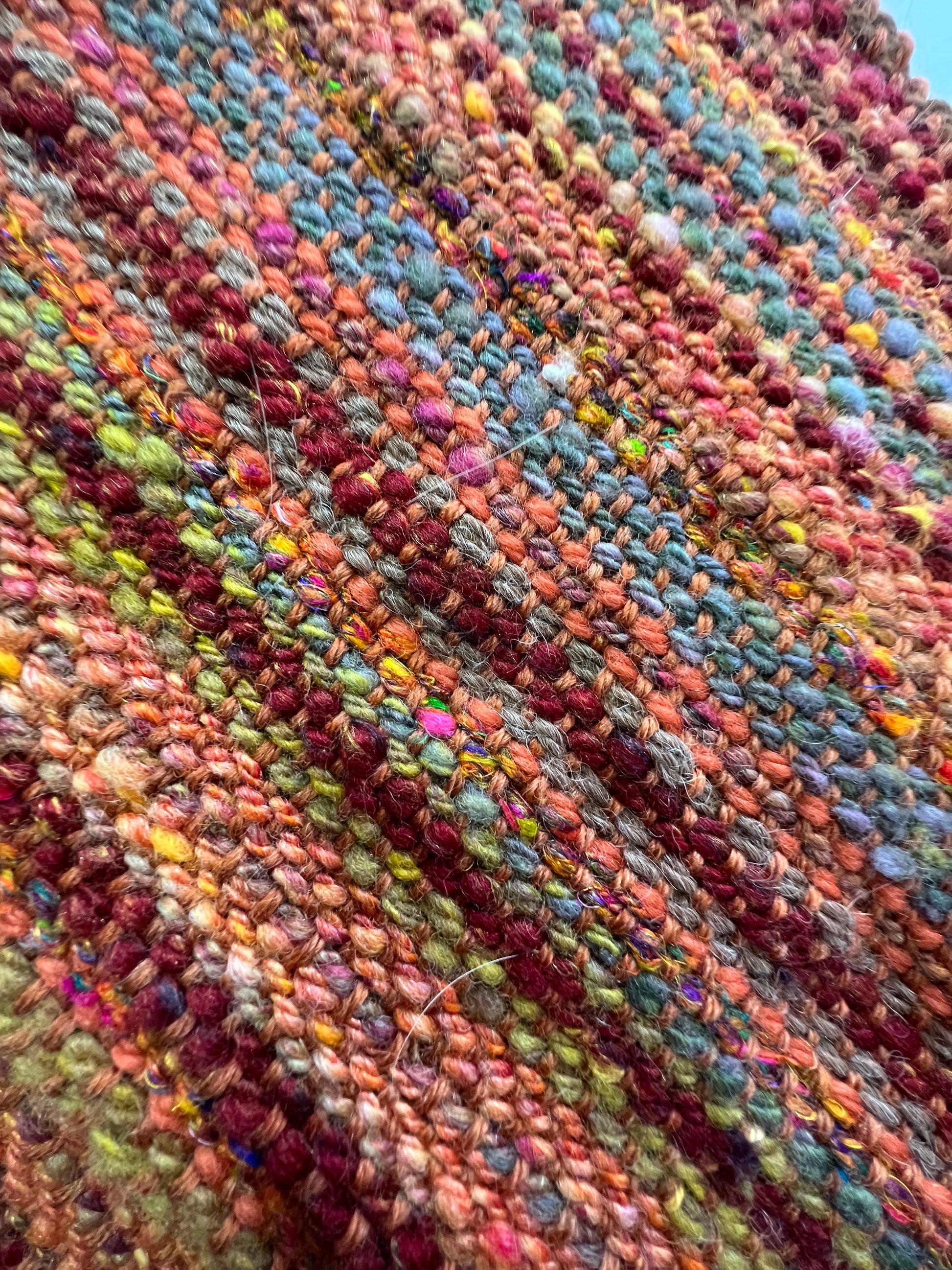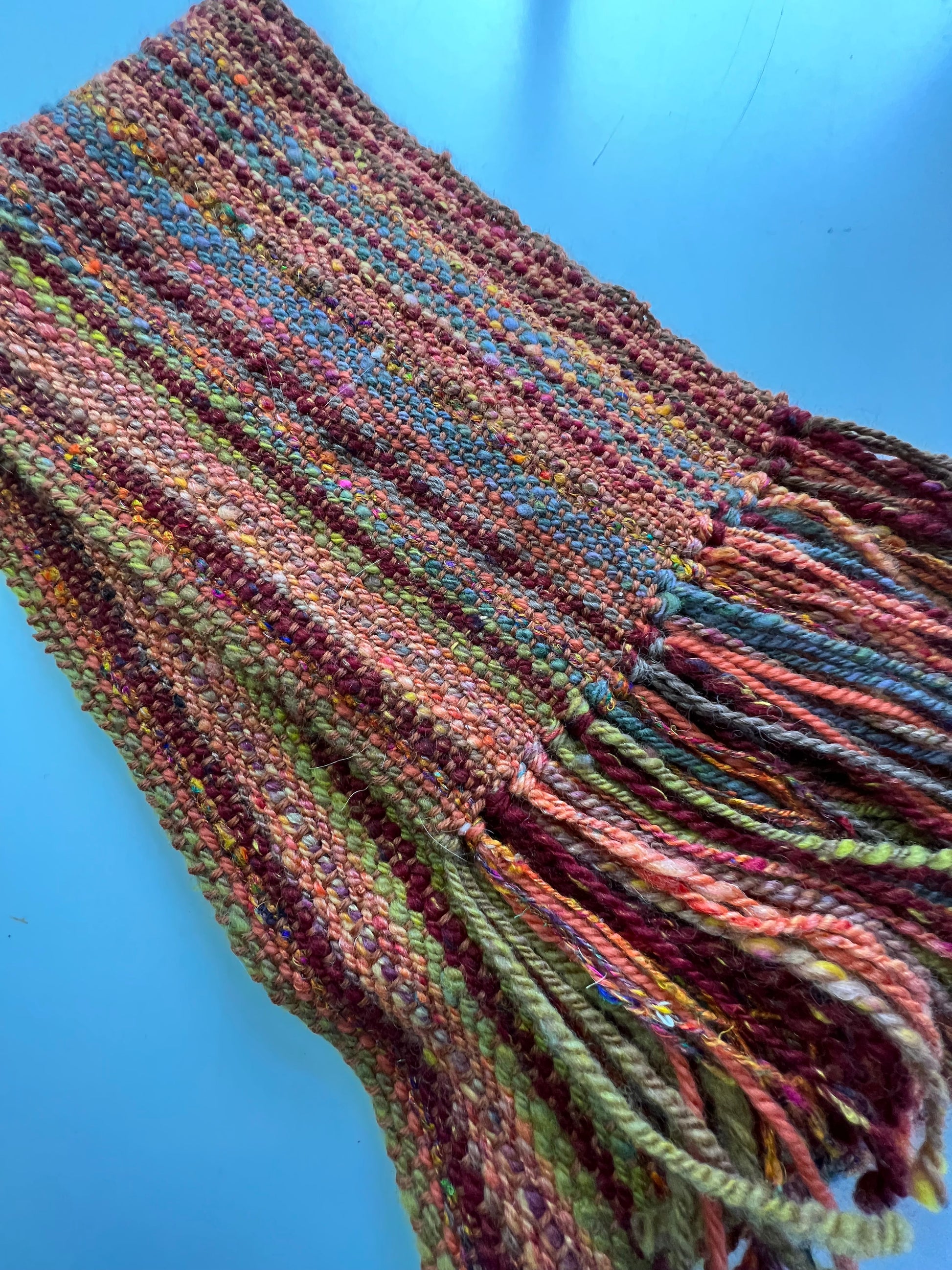 Both handspun and commercial yarns which include alpaca, wool, and silk were used to create this rich colored scarf. Ultra soft and silky hand will bring feelings of comfort. Whether this is a present for a friend or for yourself it will speak love to the wearer. The colors include green, rust,, red, brown, grey, Length 62" including fringe. Width 7 1/4 ".