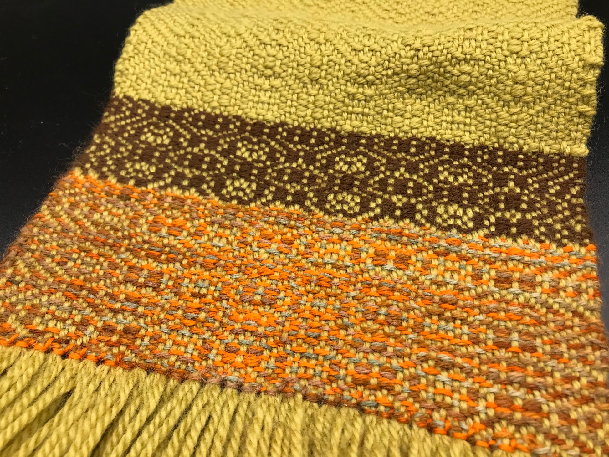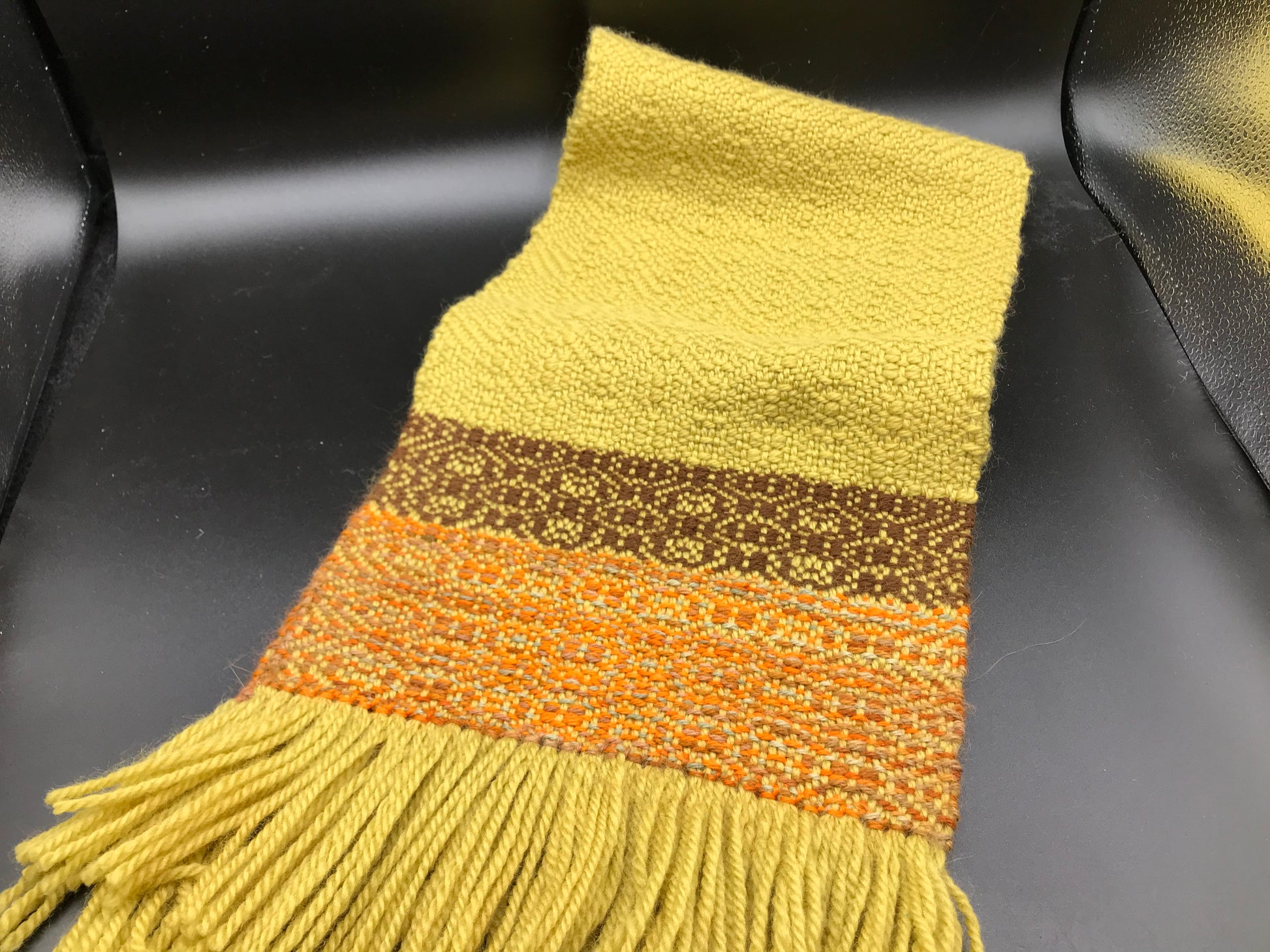 Soft wool and alpaca neck warmer. 9” wide by 37 + fringe long. Woven pattern “rosepath” adds to the texture of this scarf.