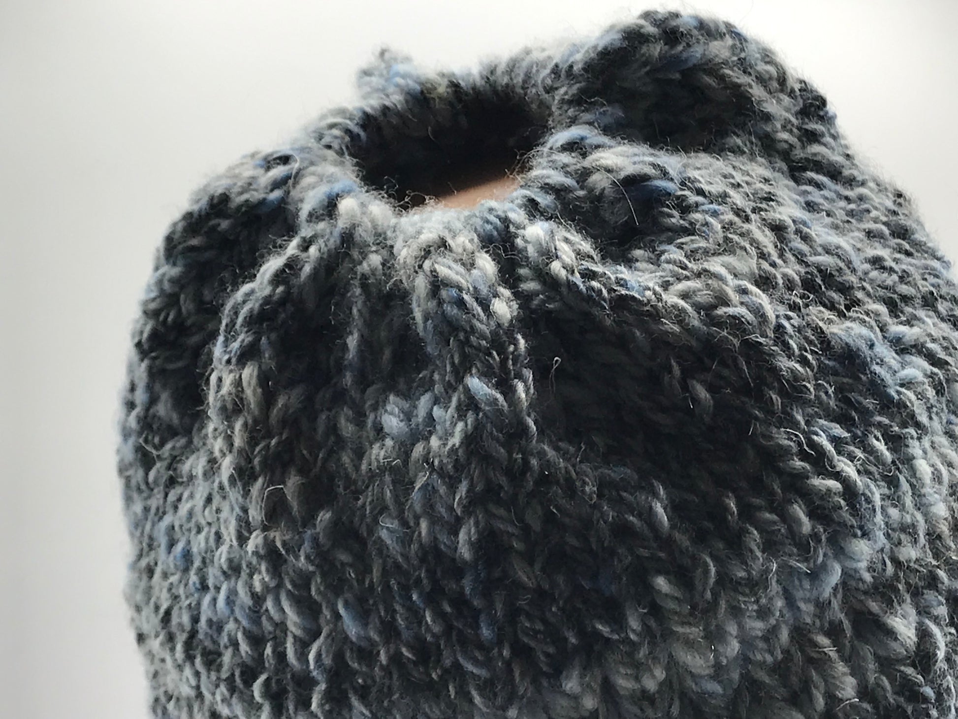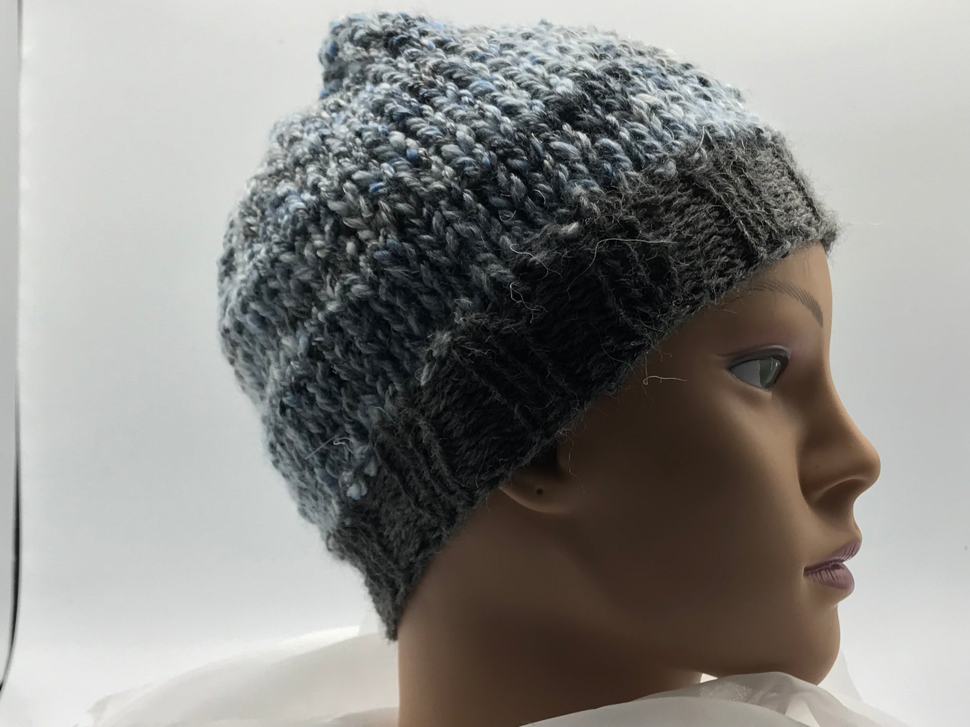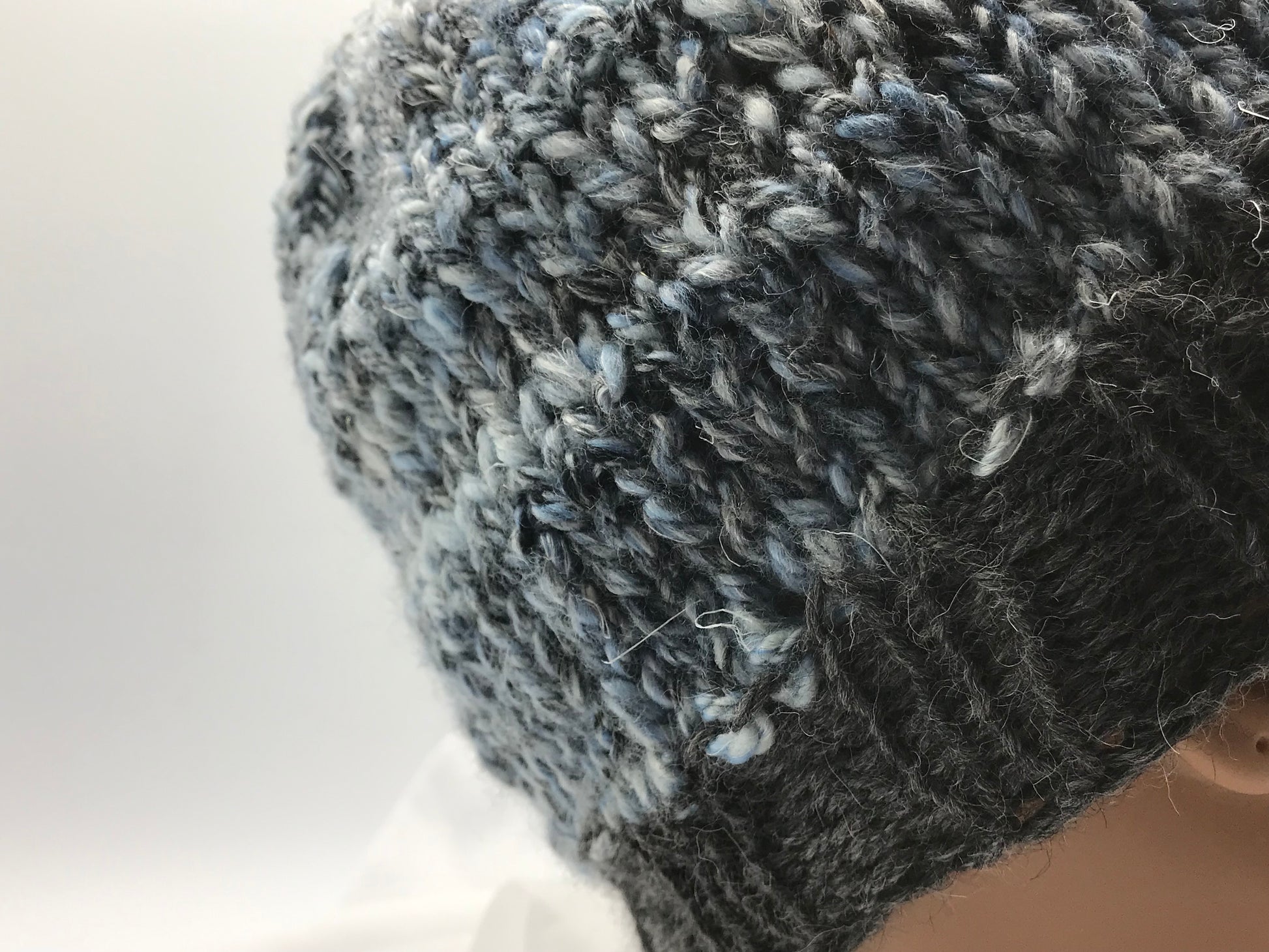 Hand spun and commercial yarn combine to created this cute ponytail hat. Show off your locks while keeping your head warm this winter. Made of merino wool and silk. Extremely soft. Opening circumference is 14" with additional stretch.