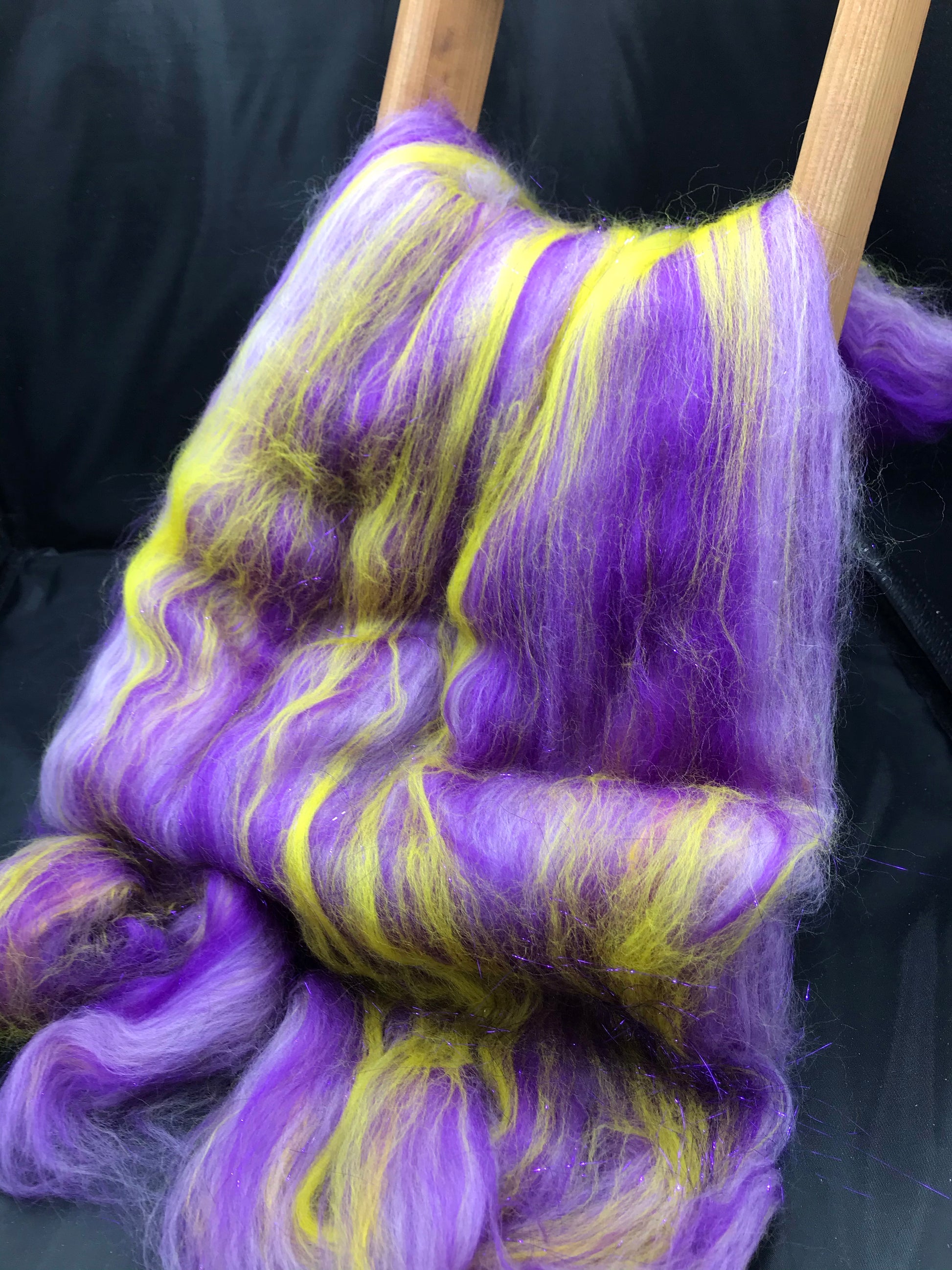 This fiber preparation is made from Merino, Bamboo and faux Cashmere. Brightly colored. This ultra smooth batt can be spun to any yarn weight but will be especially easy to spin and ply into a delicate lace, DK or fingering weight. Very smooth drafting. 2 3/4 Oz