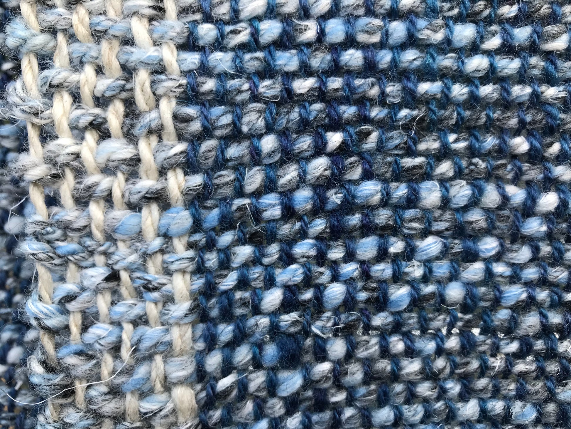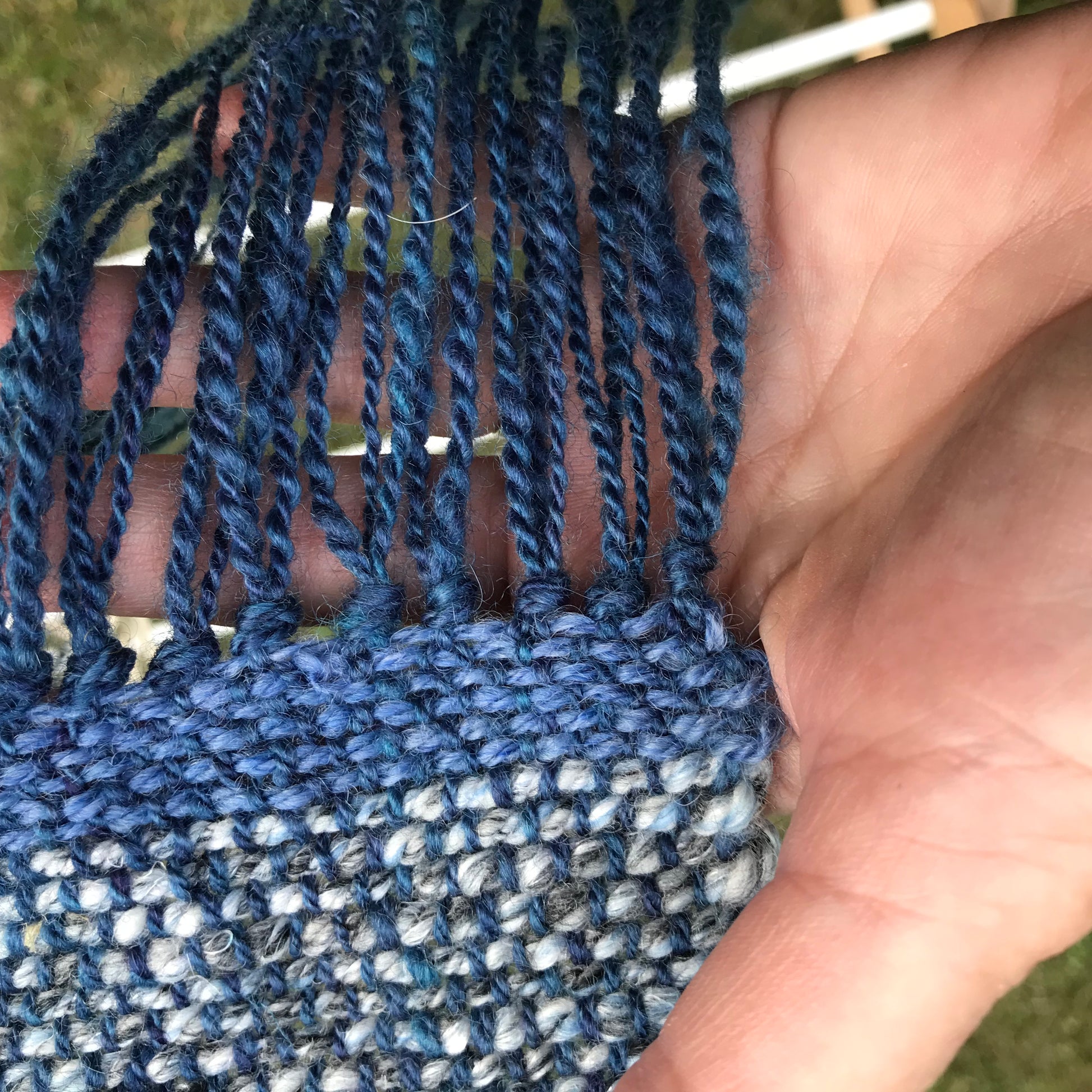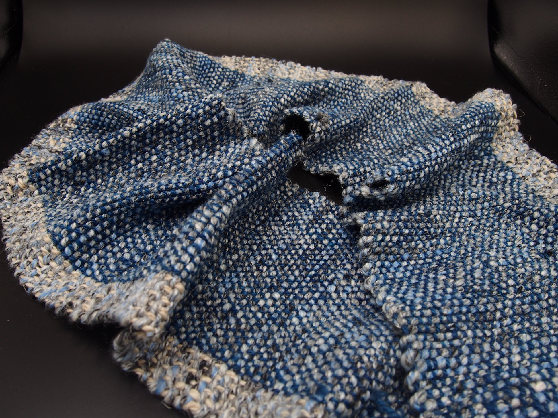 The deep blue of this scarf can speak calm into your life. Wear it as a prayer or decorative scarf. Made from soft merino and flax. This item will be next to skin soft for most people. The flax does contribute a very slight prickle factor which will soften with age. Dimensions including fringe are 56" long by 7" wide. Hand spun yarn woven into commercial background. Handwoven in plain weave. Twisted fringe.