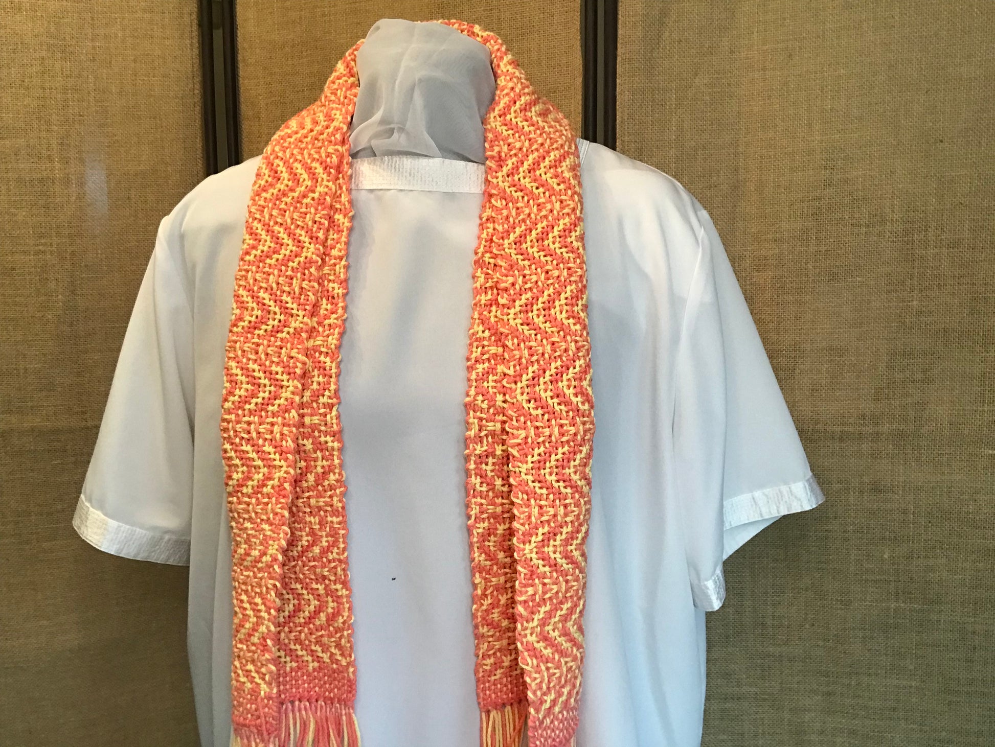 100% cotton was used to weave this colorful shadow weave scarf. Bright colors, coral and light yellow, create uplifting energy. Wearable in all seasons of the year. 56" long and 6" wide.