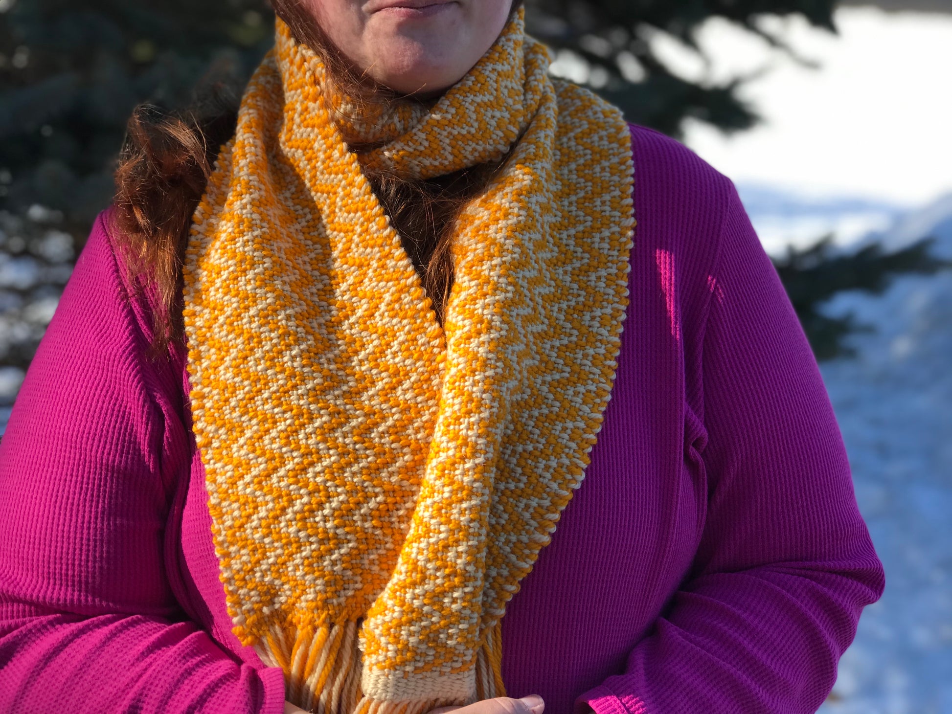 Enjoy the energy of this Saffron and Cream Zig Zag Scarf made of Merino wool. Next to skin soft. It will keep you toasty and is long enough to be worn in a variety of styles.