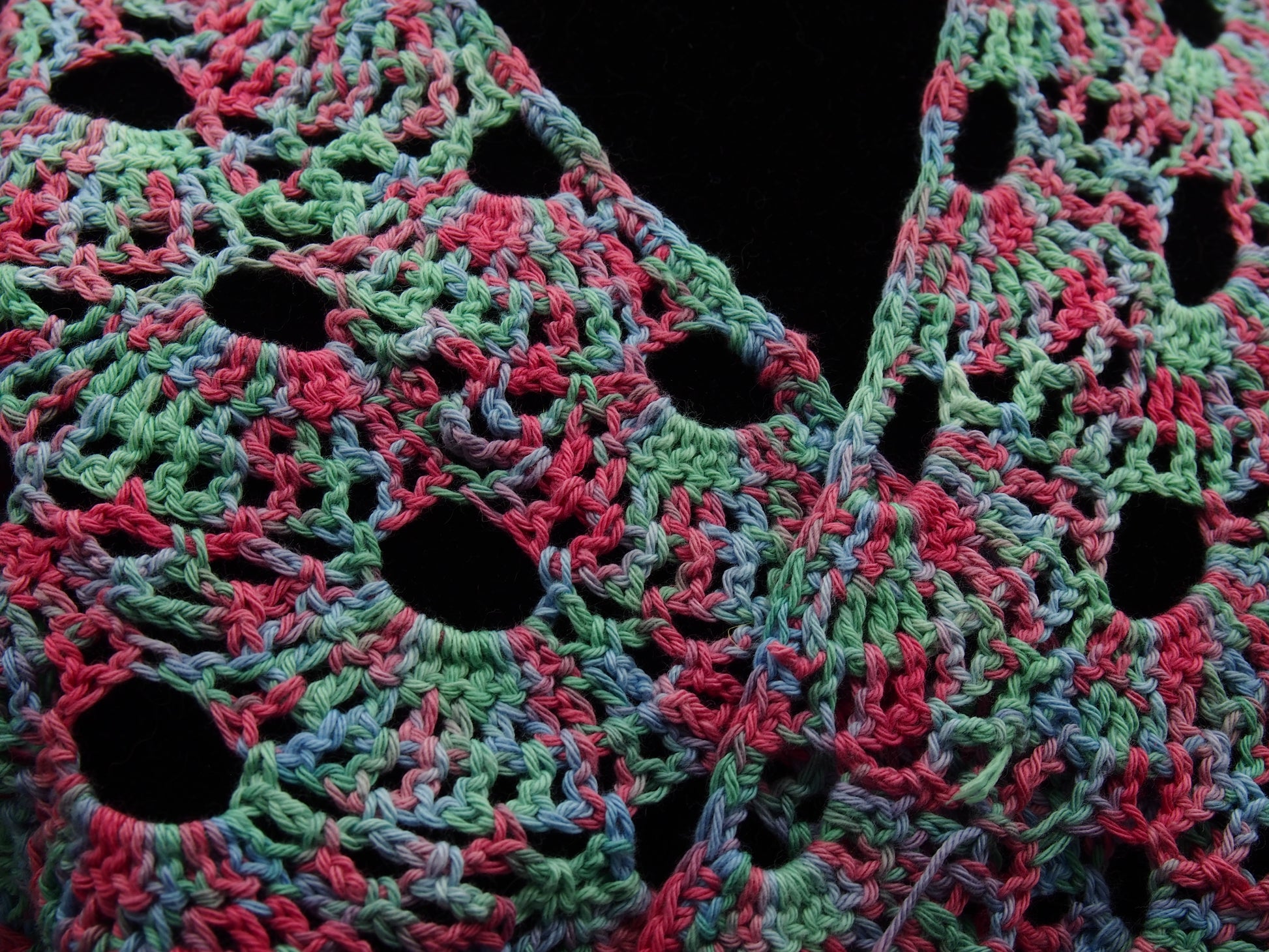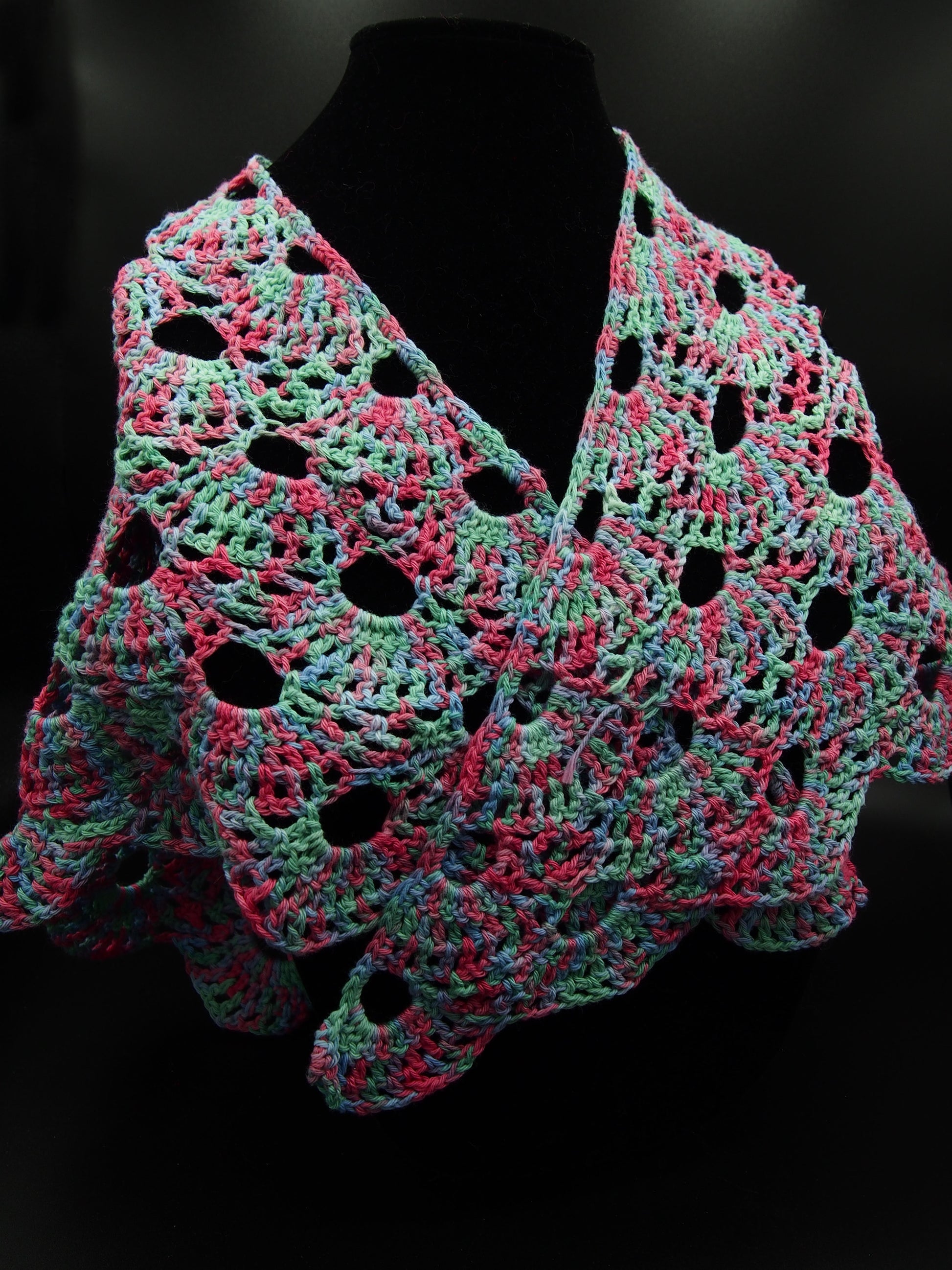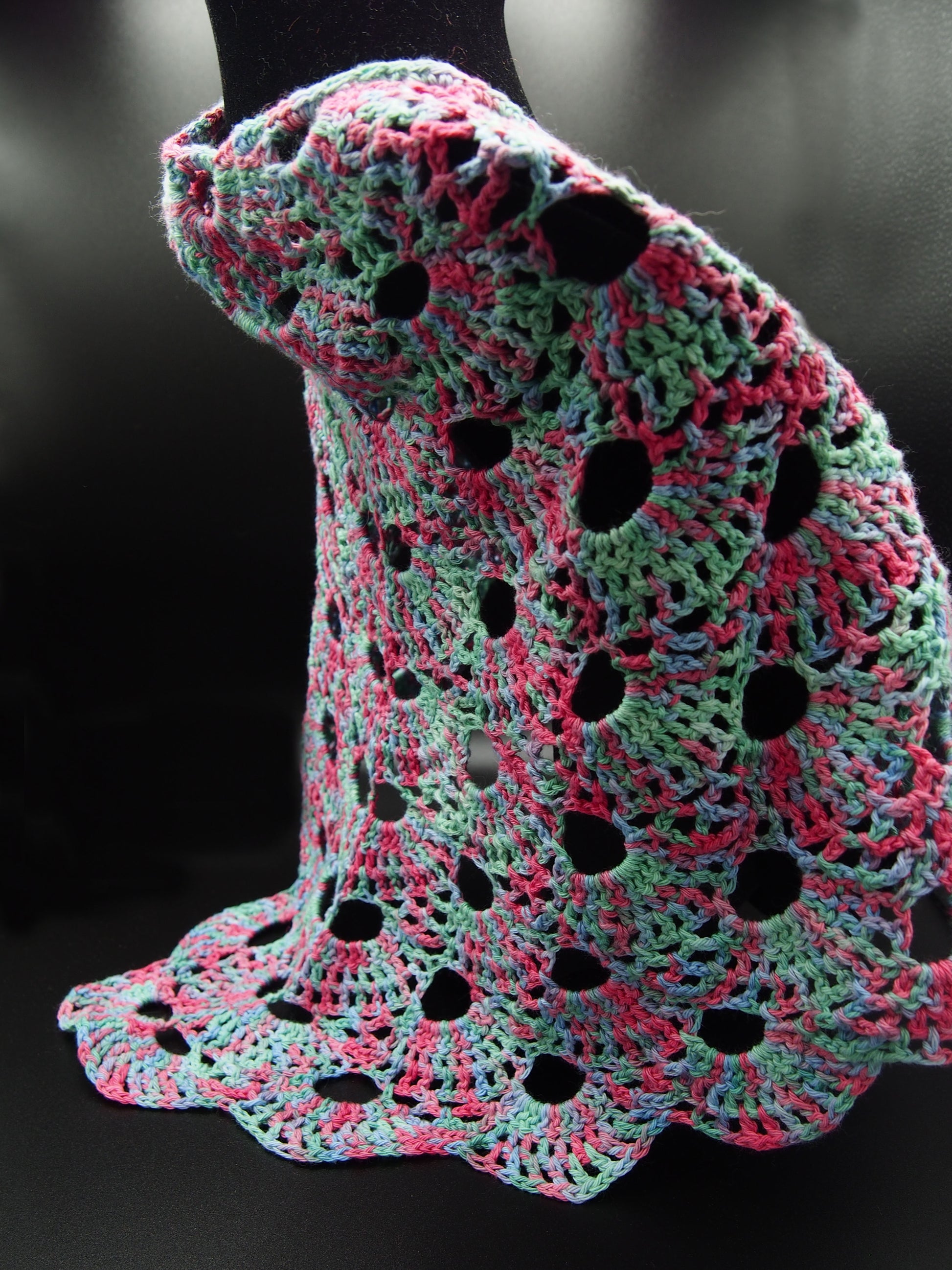 Variegated organic cotton (pink, lavender and mint) was used to make this crocheted virus pattern shawl. It is called a virus pattern because of the repeat of the motif that multiplies to create the shape of the shawl. Delicate and feminine. Dimensions: Top Edge - 41", Middle Top to bottom point- 19 1/2 "