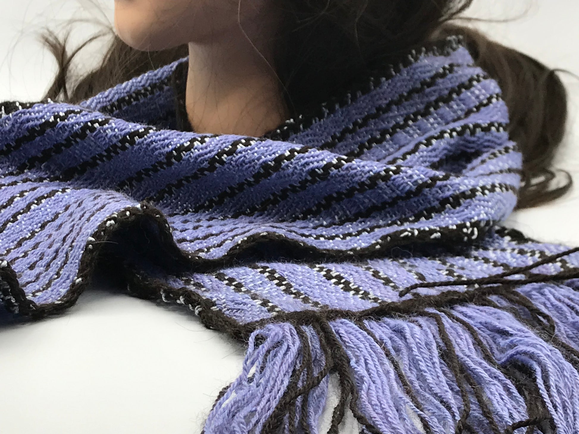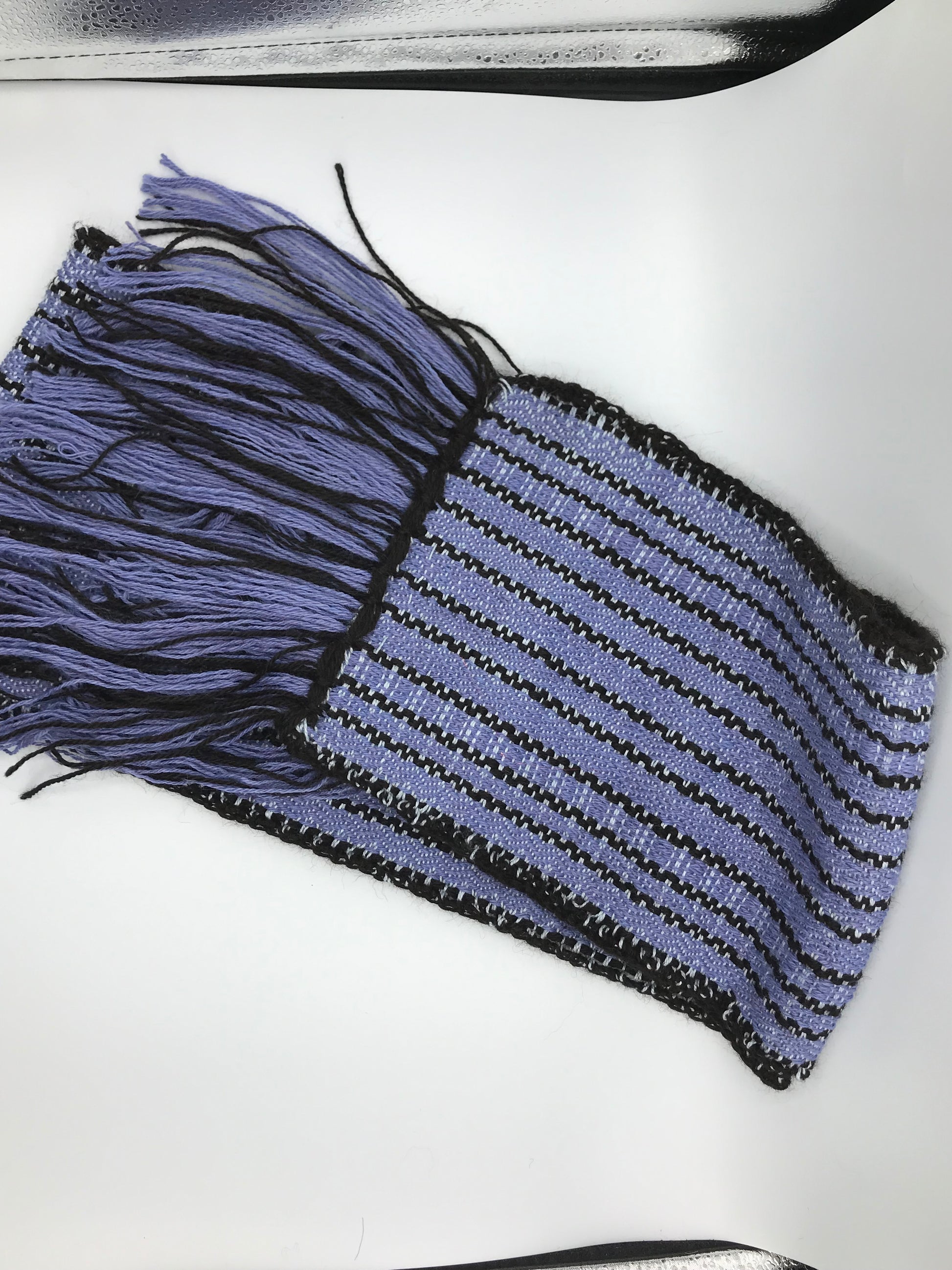 A modern take of a traditional Alpaca and silk scarf. Can be used as a dress scarf or for warmth. Extremely soft. 52" long, (plus fringe) 7 1/2" wide. Periwinkle and black.