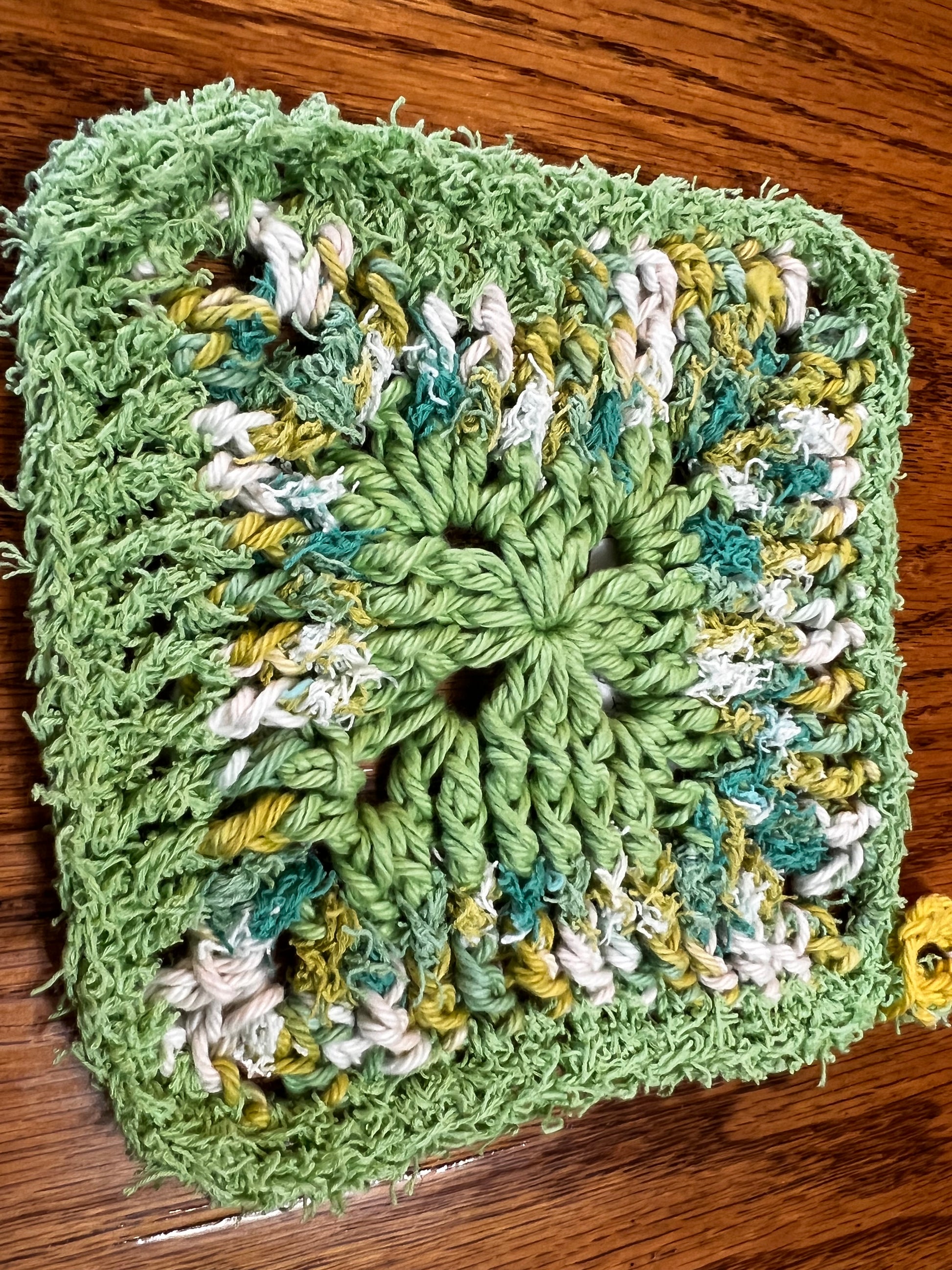 Crocheted scrubby of cotton and nylon. 6”x6”.