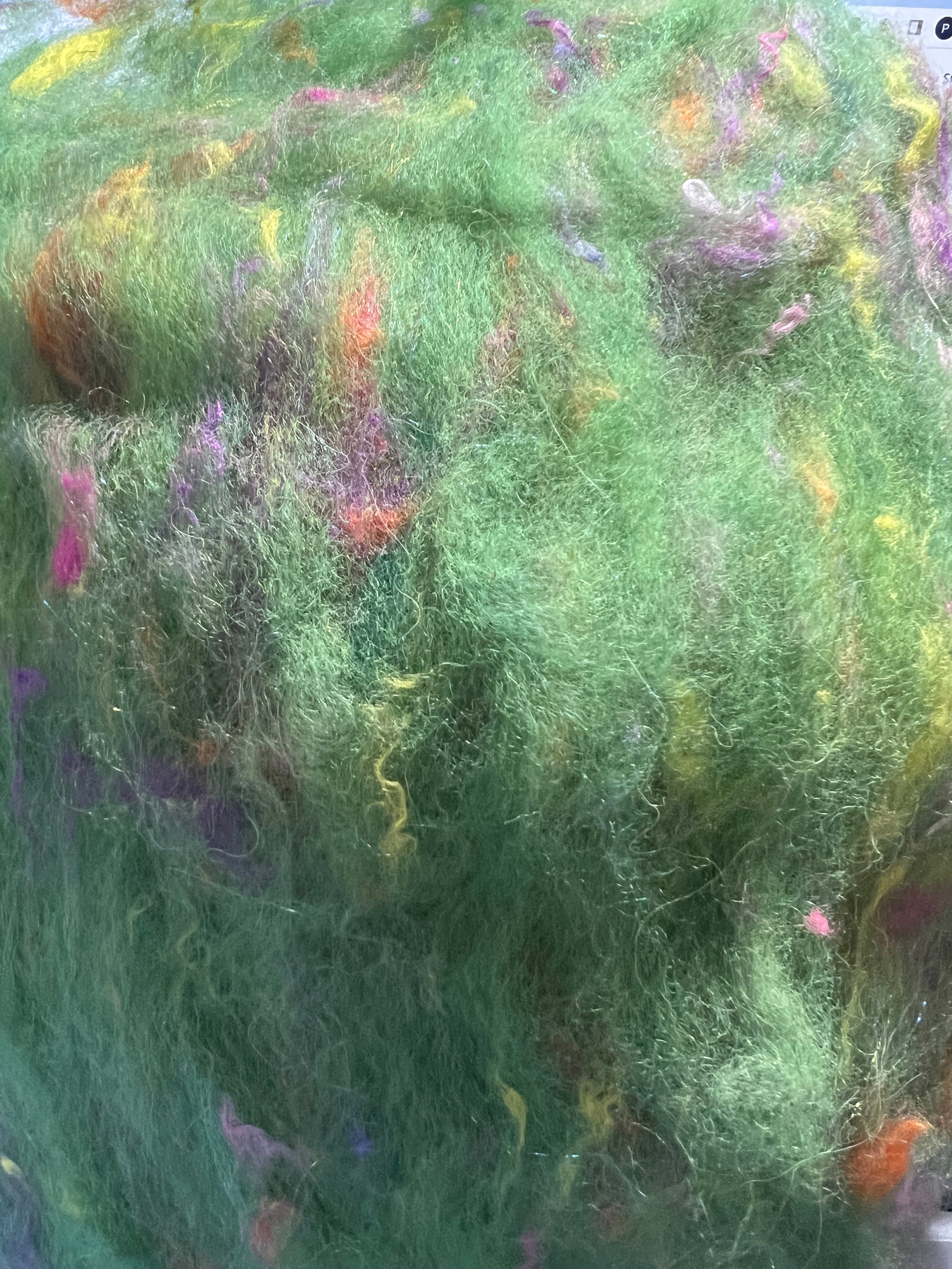 3 1/8 ounces slightly textured batt. Great for spinning on a wheel or spindle, Can also be felted or core spun.