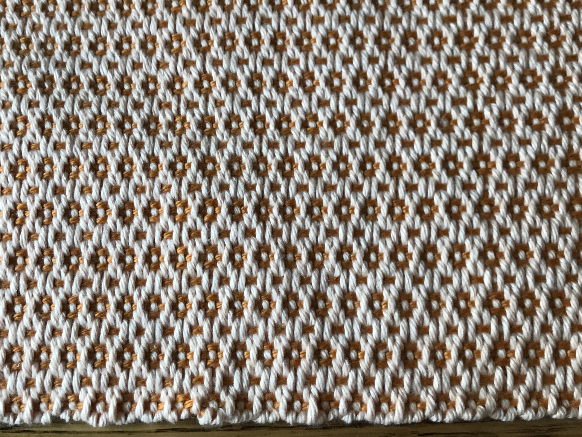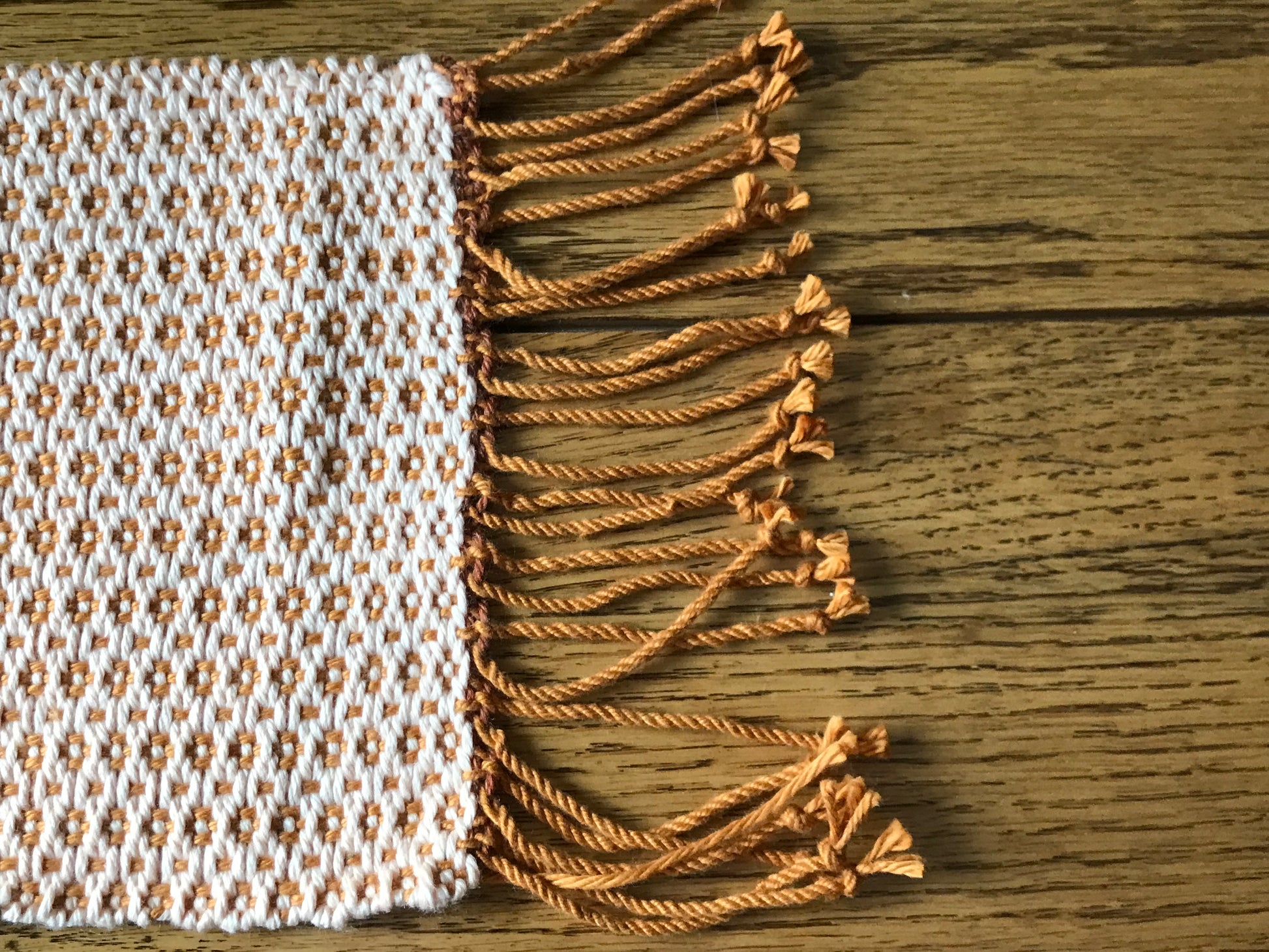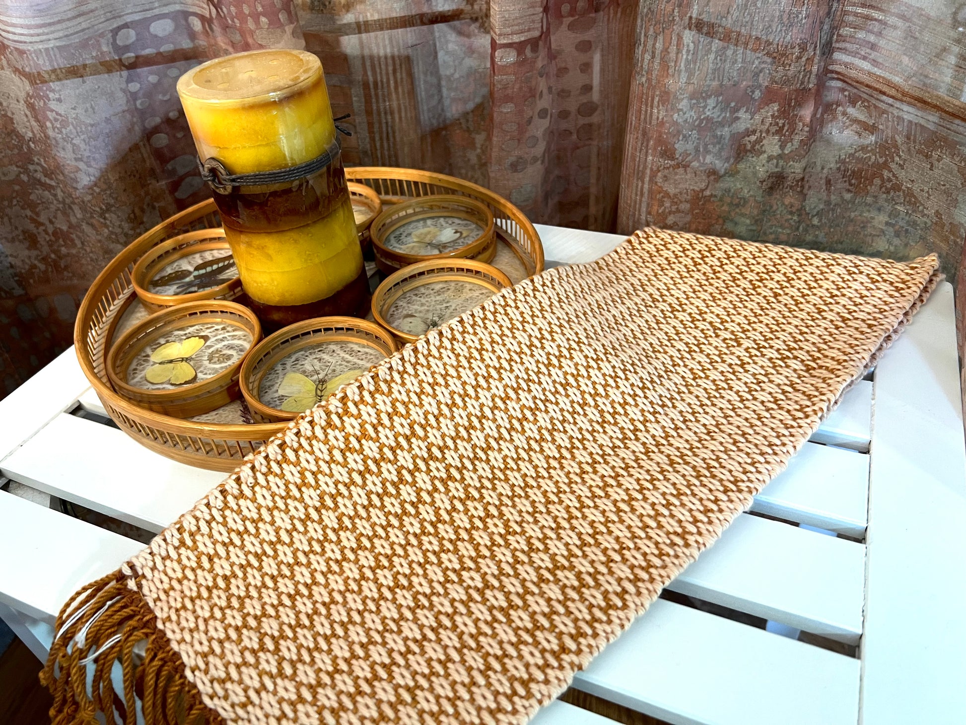 A cotton table runner to dress up your dining room or any other table in the house. 40" long (plus 3" fringe each side) 6 1/2" wide. Reversable design.