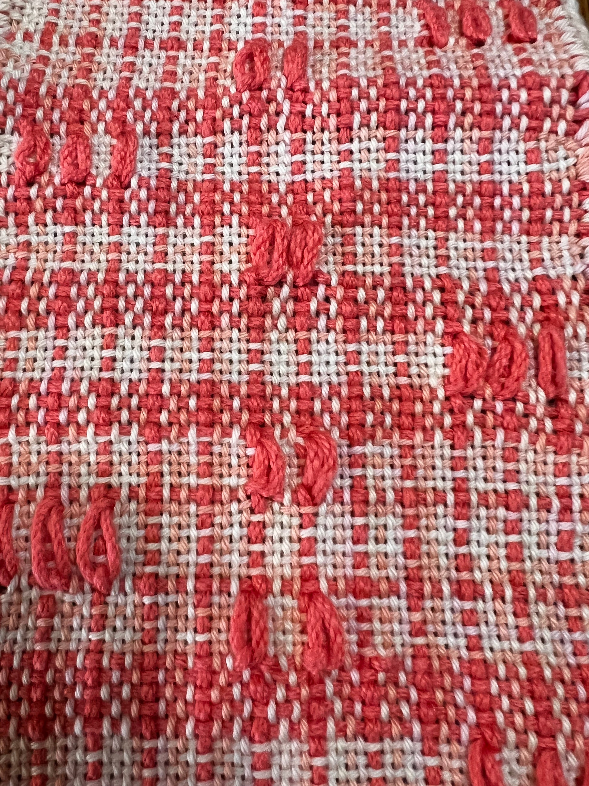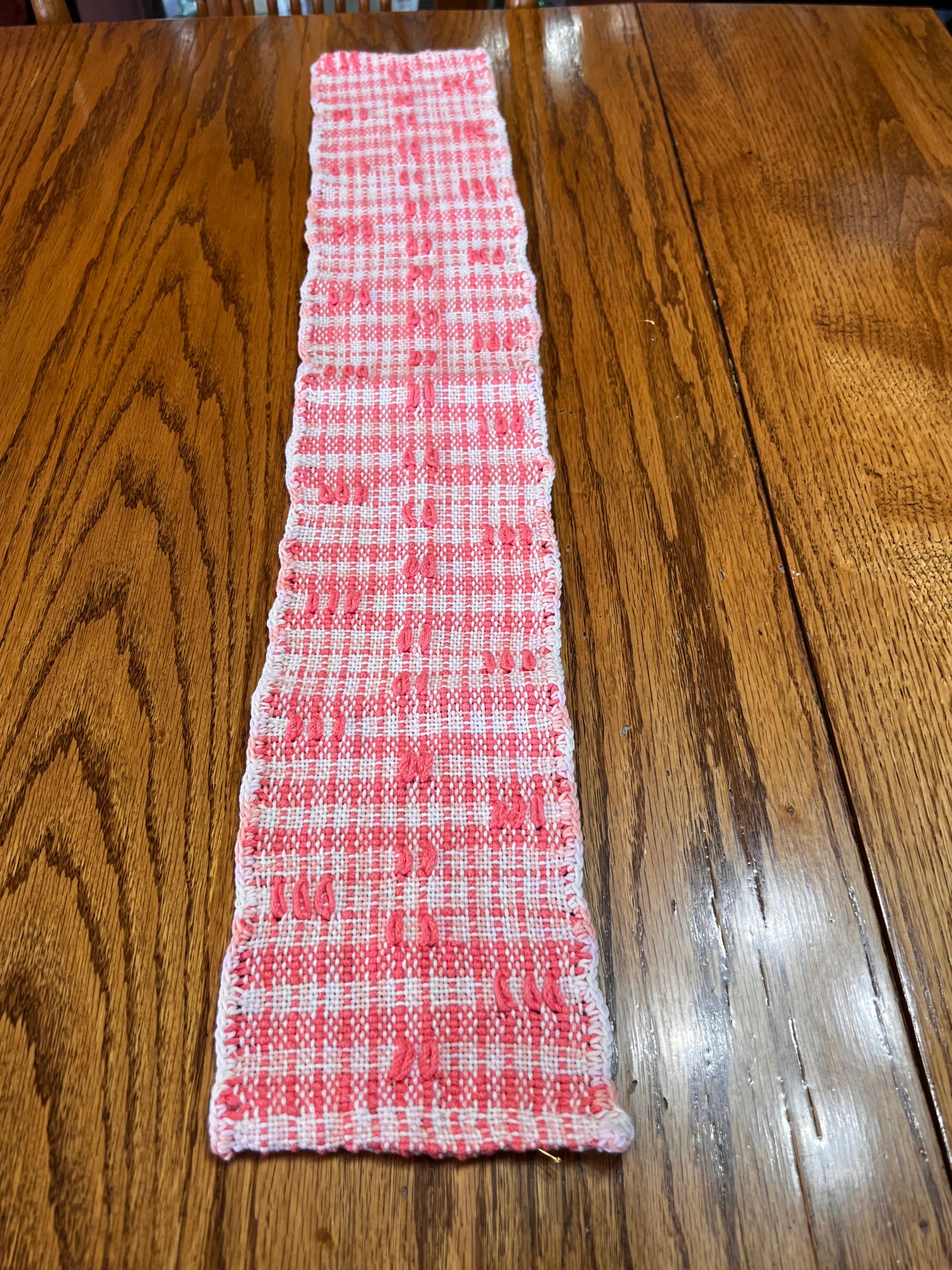 Hand-woven of cotton. Hand manipulated floats add decoration to the surface of the scarf. Length 31”. Width 5 1/2”.
