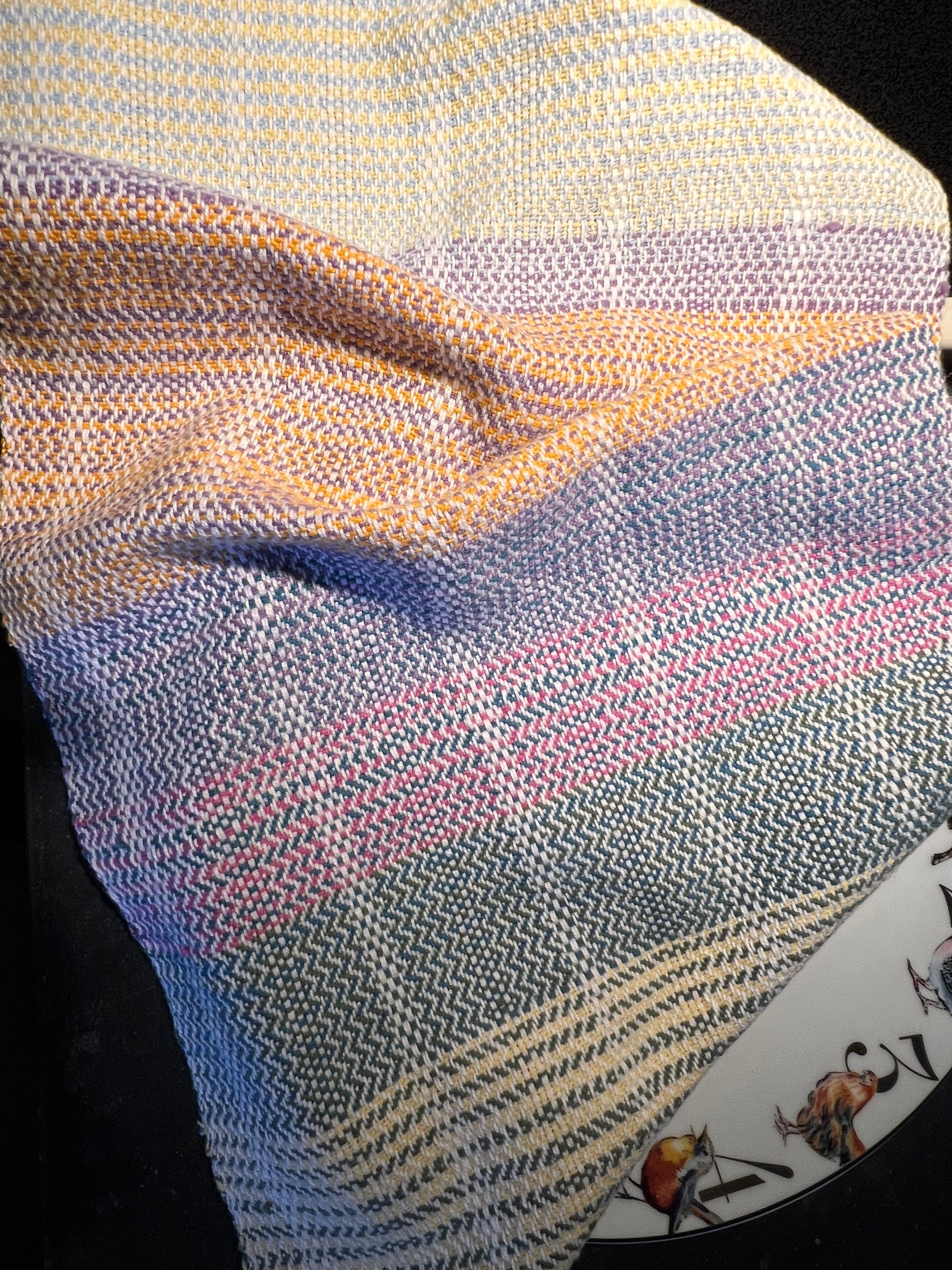 Many colored towel (green. Yellow, orange, blue, pink, purple). Hand or dish towel. Length 21 width 12”.