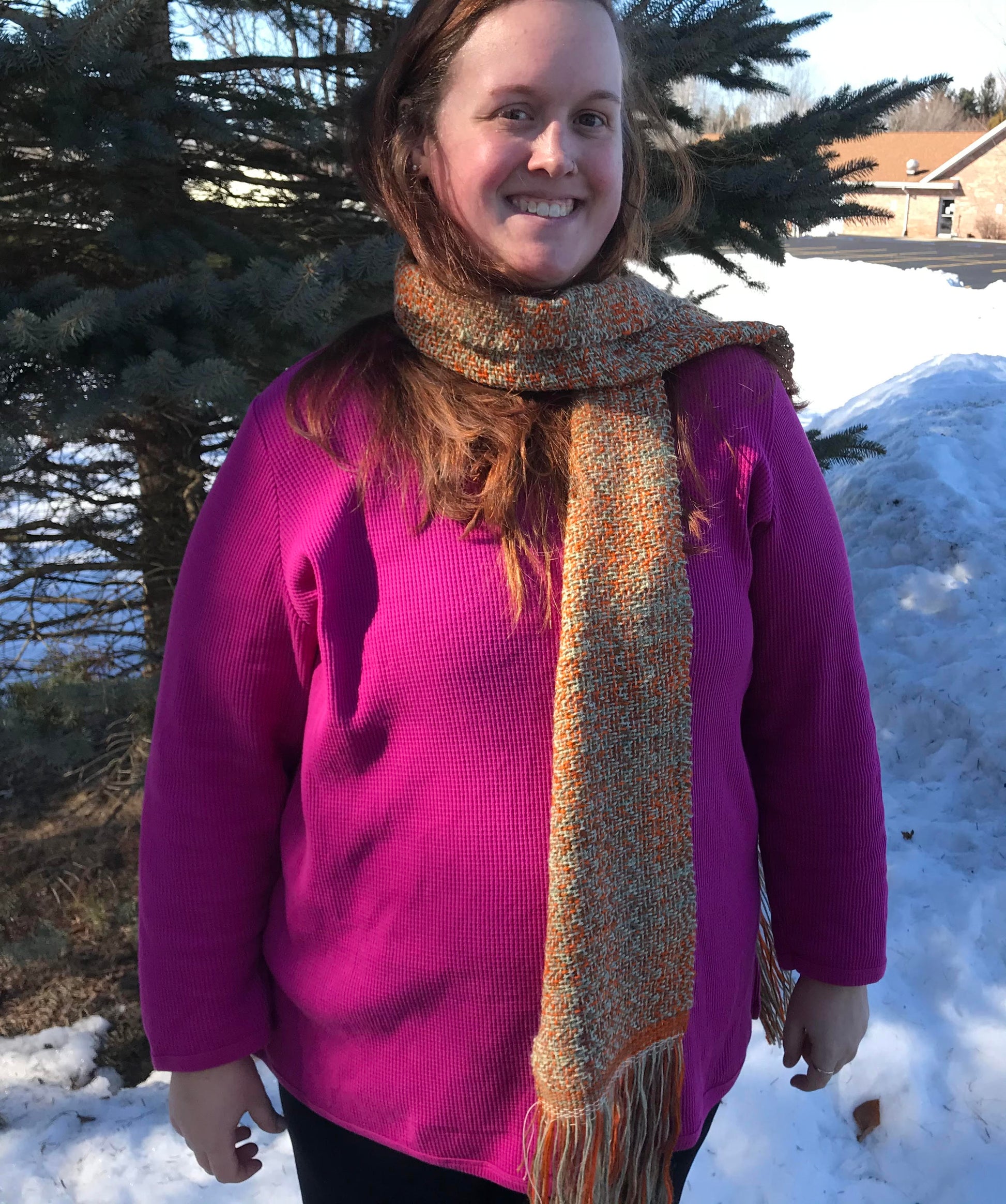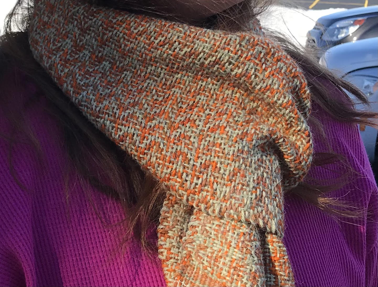 Variegated Alpaca yarn gives this scarf a unique twist on zig zag shadow weave. The Alpaca fiber provides plenty of warmth and next-to-skin soften without feeling weighty. Hand finished edging holds the weave in place. The colors, olive and pumpkin communicate an earthy feel. 8" wide, 72" long with 6" fringe (if you prefer shorter fringe let me know, I can shorten it for you.)