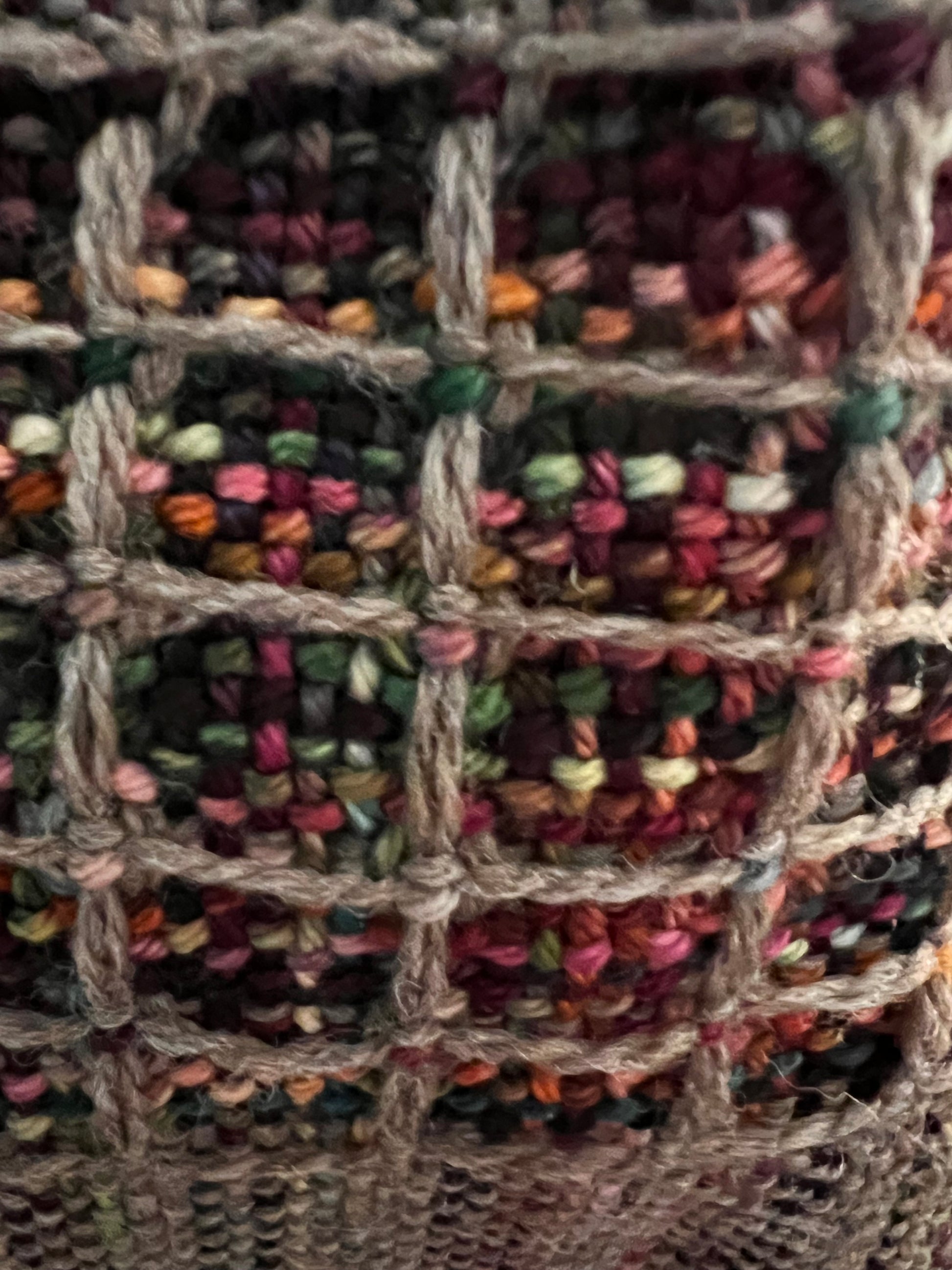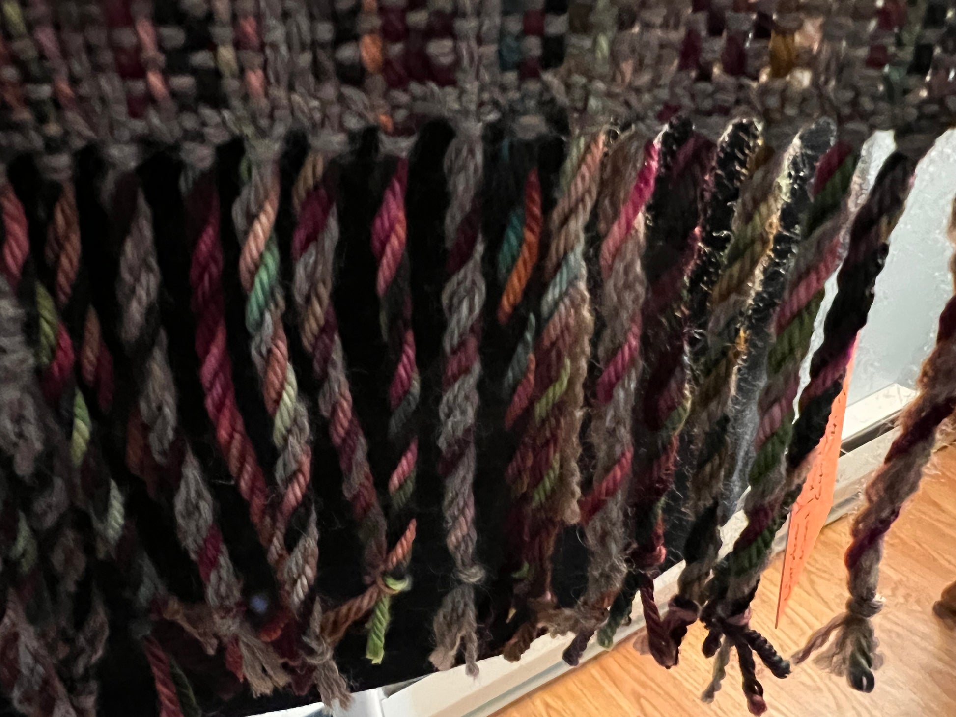 Hand-woven from merino wool and alpaca. Amazingly soft with a lovely drape. Windowpanes of vibrant color alternate with patches muted by the addition of gray. Length 64” width 6”. Fringe has been twisted into tassels.
