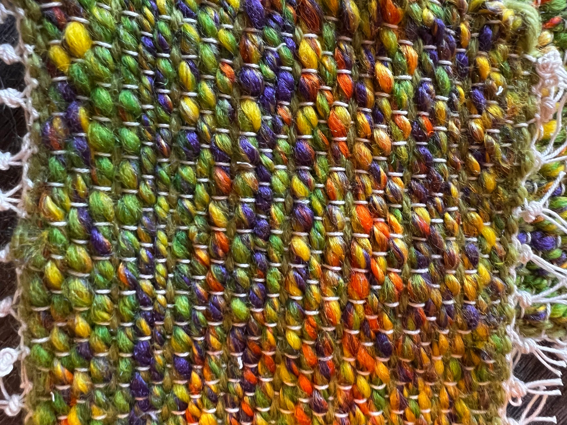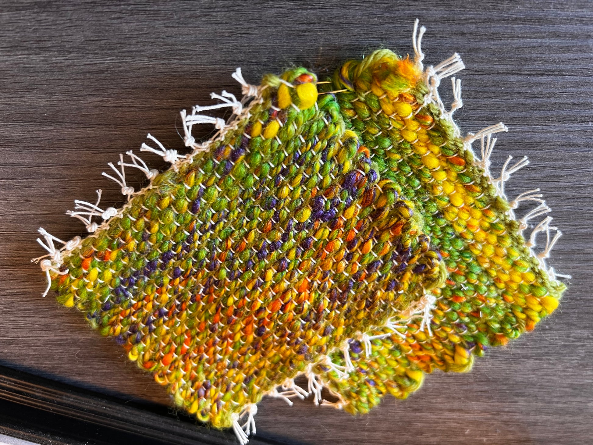 Woven in wool of green, yellow, orange and purple. These mug rug will inject a splash of color into your winter! Absorbent. Set of 2.